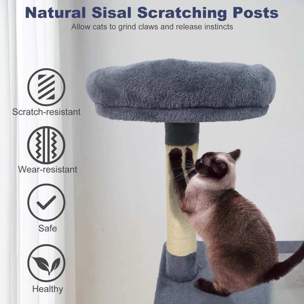 Satisfy Scratching Needs: The cat tower is equipped with several natural jute scratching posts that allow cats to grind claws and release instincts. Reliable jute ropes are designed to be wear-resistant and safe for daily use.