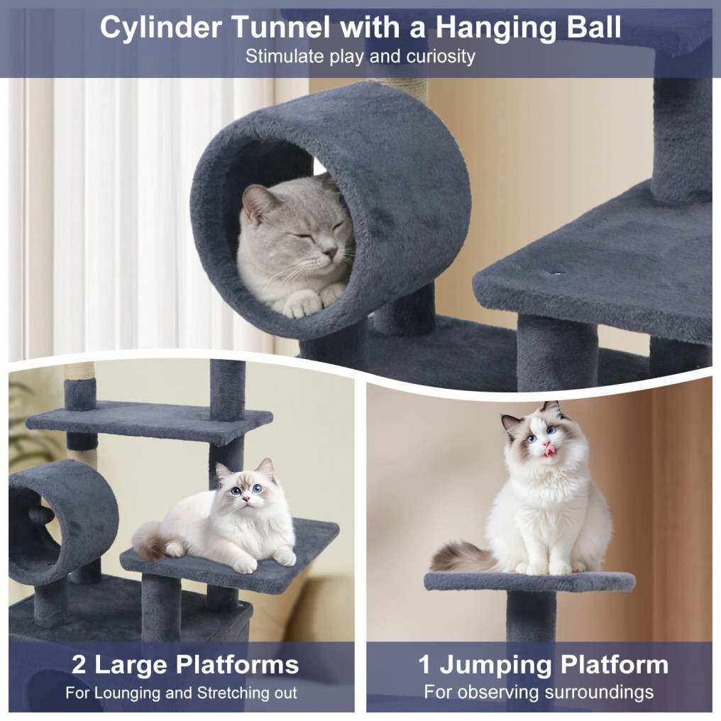 Fun & Engaging Structure: This cat climbing stand comes with a playful cylinder tunnel for interactive exploration, paired with a dangling ball inside to stimulate play and curiosity. Plus, there are 2 large platforms for lounging and stretching out, 1 small platform for observing surroundings.