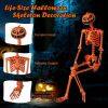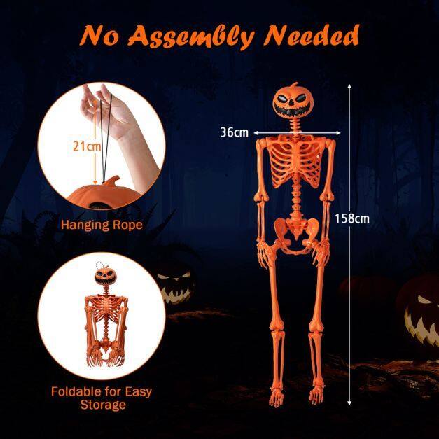 ● Pumpkin Head Design: This 5.5 ft life-size Halloween skeleton decoration features a unique pumpkin head. The vibrant orange color adds an eye-catching and spooky touch, perfect for creating a haunting ambiance.