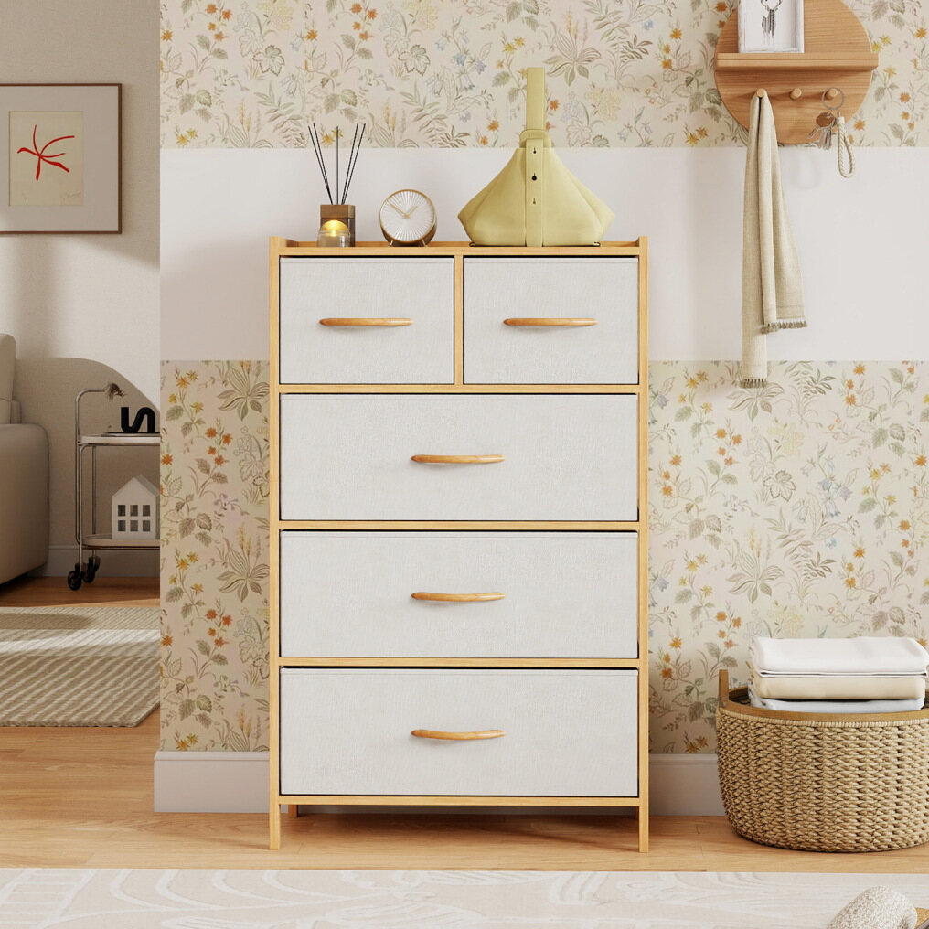 ● Considerate Details: The dresser comes with 5 foldable fabric drawers to simplify assembly process and storage. Additionally, the raised edges prevent daily items from falling while solid beech handle allows for easily opening and closing the drawers.