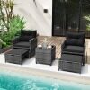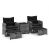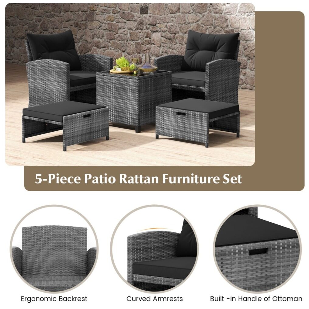 Crafted with built-to-last and fade-resistant PE rattan, the whole patio set adds a touch of sophistication to any space. And the chairs are comfortable to sit with ergonomic backrest and curved armrests. Moreover, the cushions on the chairs and ottomans bring you more coziness. And the versatile ottomans serve as footrests, extra seats or side tables for more convenience. This 5-piece patio set combines comfort and style, creating an inviting oasis for leisure moments.