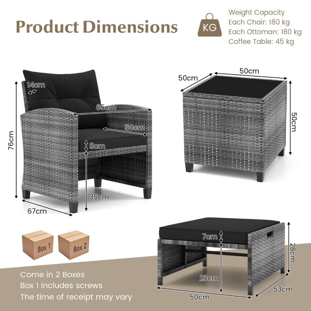 Awesome Relaxing Choice: As a perfect blend of coziness and elegance, this 5-piece outdoor wicker set will be an awesome addition to backyard, poolside, front porch and so on. Dimension of chair: 67 x 65 x 76 cm (L x W x H). Dimension of ottoman: 53 x 50 x 28 cm (L x W x H). Dimension of coffee table: 50 x 50 x 50 cm (L x W x H).