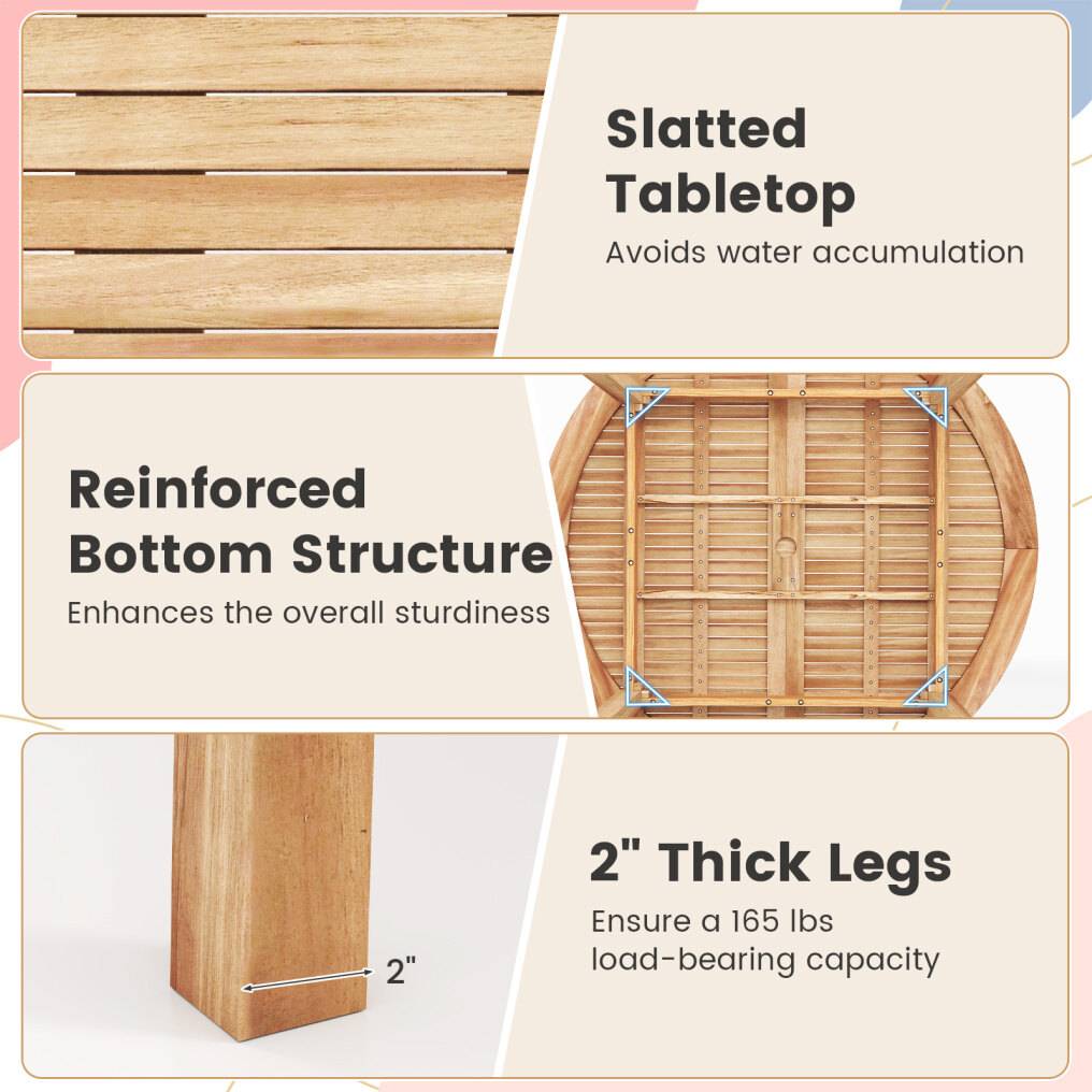 ● Solid Acacia Wood: This outdoor table and chairs set is crafted from solid acacia wood, known for its natural beauty and high hardness, bring aesthetic appeal while ensuring durability. Plus, the 2” thickened table legs provide reliable support. Please regularly oil (not included) the wood surface for optimal maintenance.