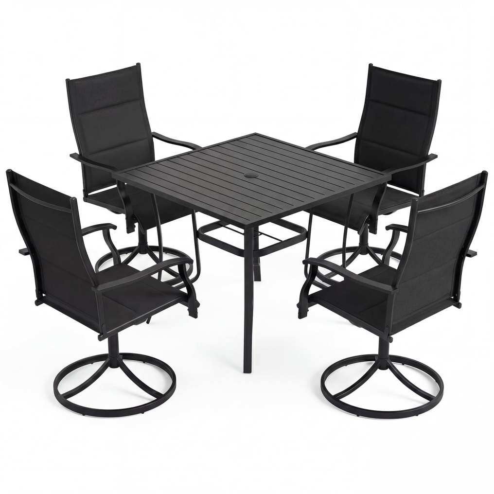 ● Optimal Seating Experience: This outdoor dining set caters to your comfort needs with its ergonomic high back and curved armrests, ensuring you enjoy your leisure time. Encased in breathable fabric, the chairs offer excellent airflow, keeping you cool. Soft padding makes this set an ideal choice for your garden or poolside setup.