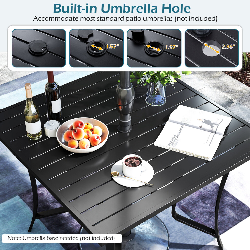 ● Square Table with Umbrella Hole: This 36” square table includes a umbrella hole with 3 diameter options (1.57”/1.97”/2.36”) to fit most standard umbrellas (umbrellas and base not included), ensuring that you can dine in comfort, shielded from the sun. Plus, a removable lid allows you to cover the hole, maintaining the sleek appearance.