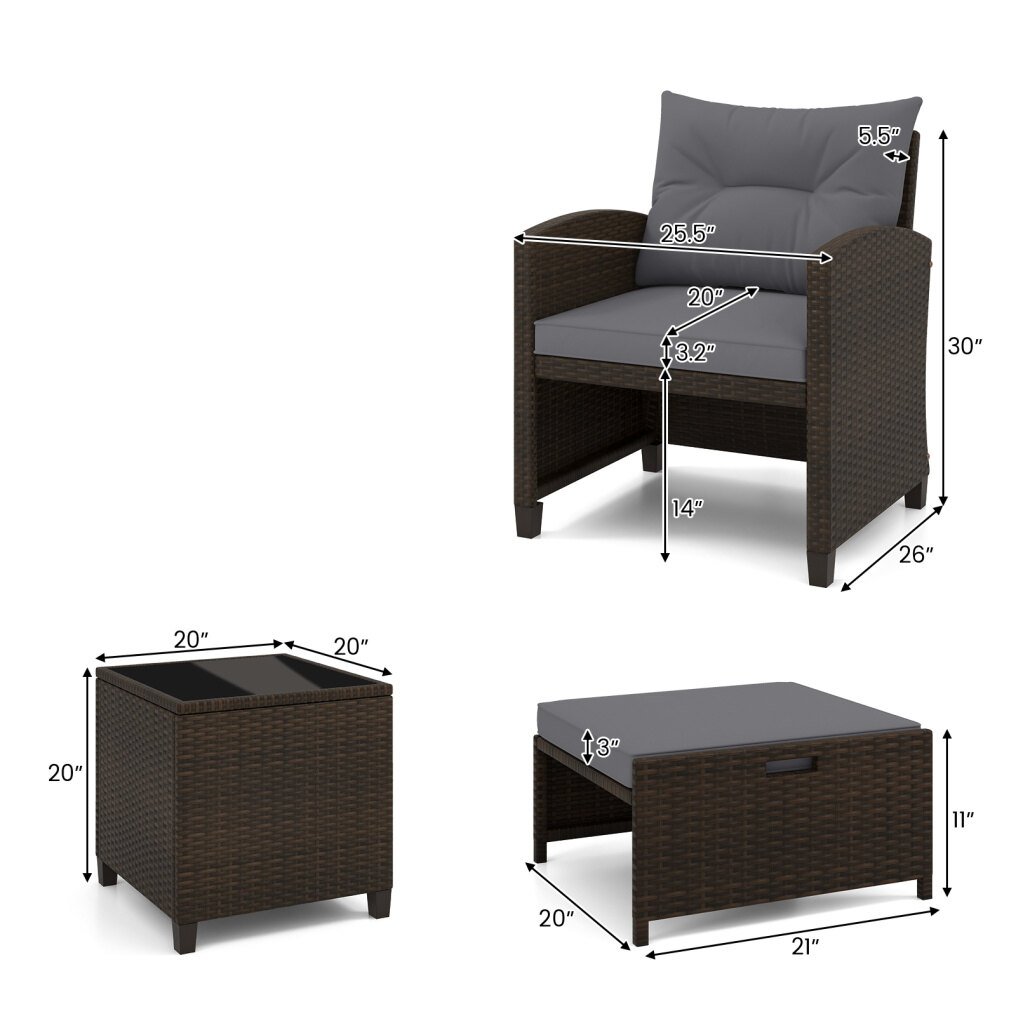 ● Awesome Relaxing Choice: As a perfect blend of coziness and elegance, this 5-piece outdoor wicker set will be an awesome addition to backyard, poolside, front porch and so on. Dimension of chair: 26" x 25.5" x 30" (L x W x H). Dimension of ottoman: 21" x 20" x 11" (L x W x H). Dimension of coffee table: 20" x 20" x 20" (L x W x H).
