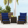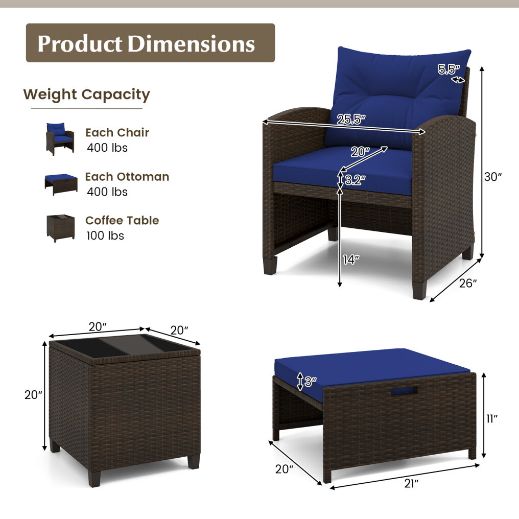 ● Awesome Relaxing Choice: As a perfect blend of coziness and elegance, this 5-piece outdoor wicker set will be an awesome addition to backyard, poolside, front porch and so on. Dimension of chair: 26" x 25.5" x 30" (L x W x H). Dimension of ottoman: 21" x 20" x 11" (L x W x H). Dimension of coffee table: 20" x 20" x 20" (L x W x H).