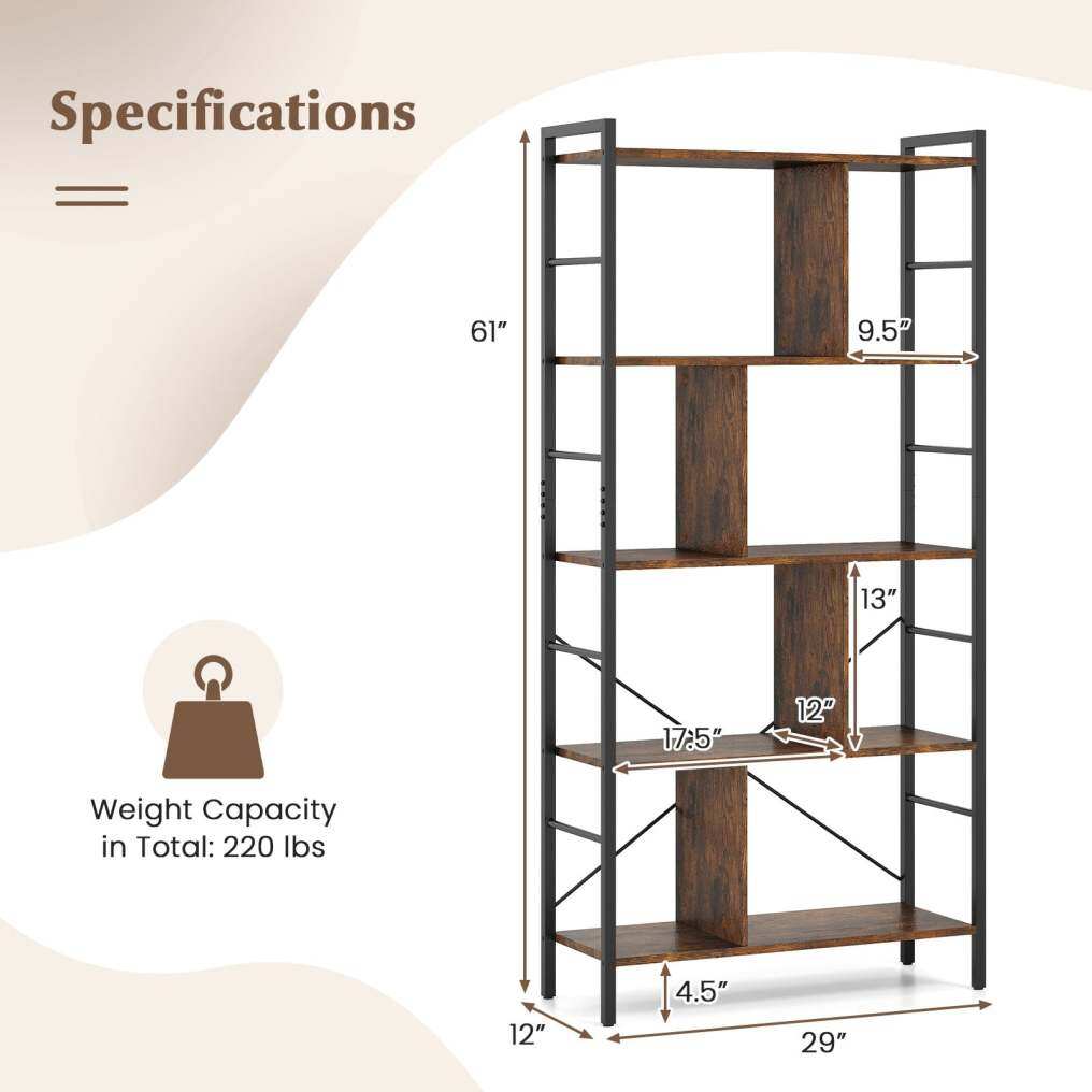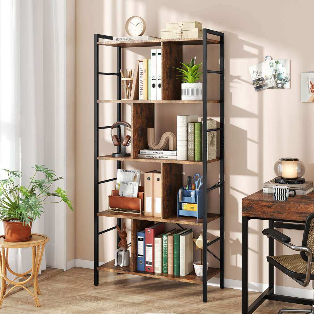 ● Maximize Your Storage with Style: This 5-tier bookshelf features 5 open shelves with unique geometric dividers, perfect for organizing books, decorations, and more. The side rails double as hanging spots, adding extra functionality to your space!