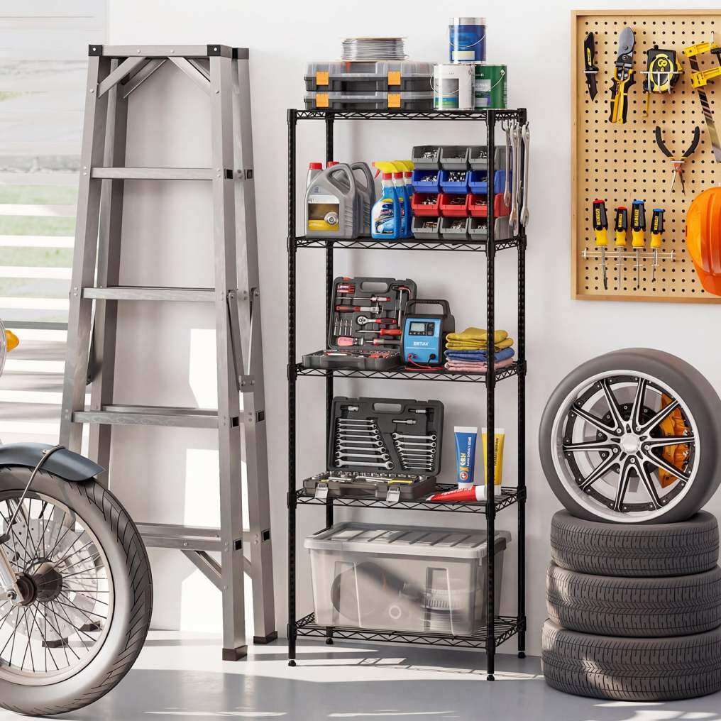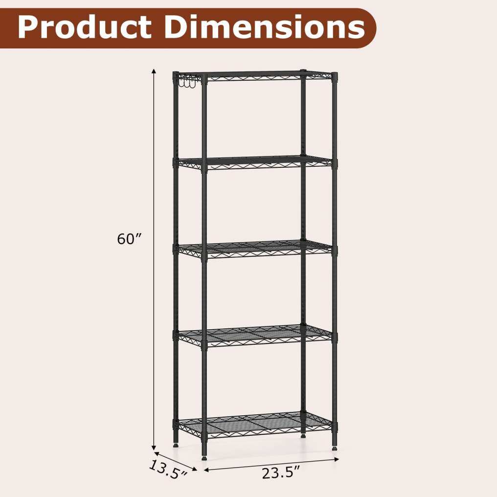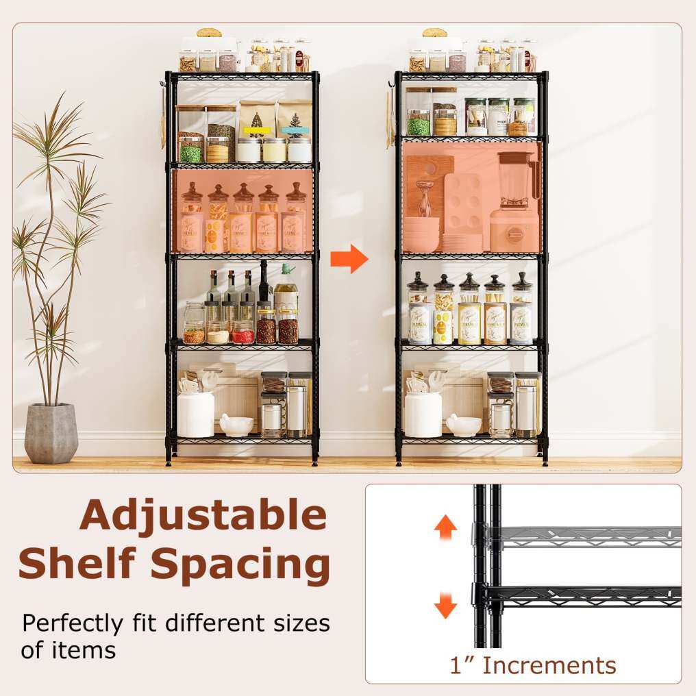 ● Versatile Organizer for Any Space: Ideal for a variety of settings, the 5-tier storage shelves transform chaos into order in kitchens, pantries, offices, garages, basements, and beyond. From tools and gardening supplies to household essentials, it maximizes space efficiency.
