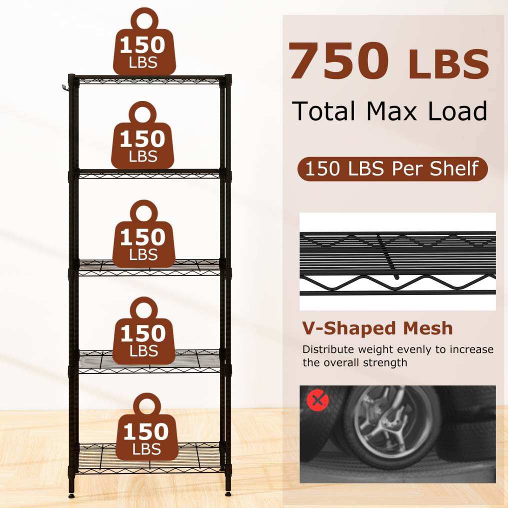 ● Heavy-Duty Metal Construction: Crafted from thickened metal tubes with a reinforced V-shaped mesh design, our heavy-duty wire shelving unit delivers exceptional strength and durability. It supports up to 750 lbs total and 150/ 250/ 800 lbs per shelf, ensuring reliable storage for various industrial and household needs.