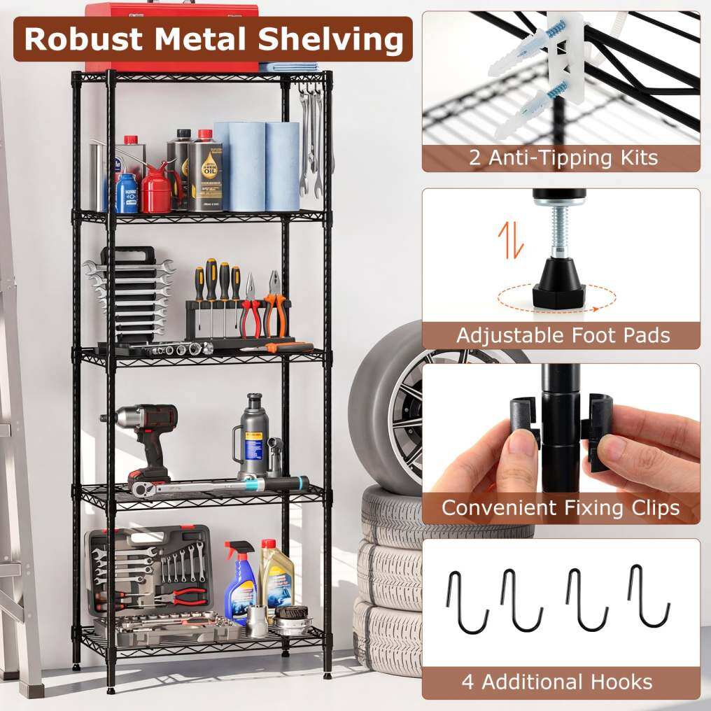 ● Enhanced Stability and Safety: Equipped with leveling feet, this metal wire shelving rack adjusts to uneven surfaces, ensuring stability wherever it's placed. For added safety, 2 anti-toppling kits are included to prevent the unit from tipping.