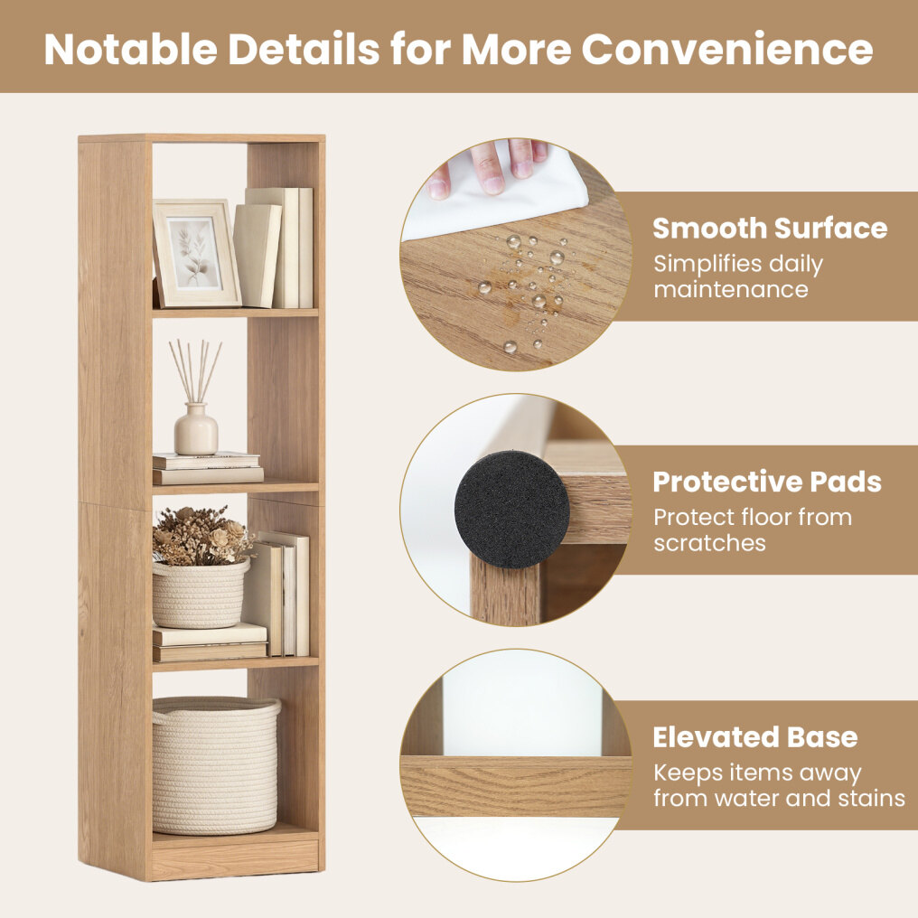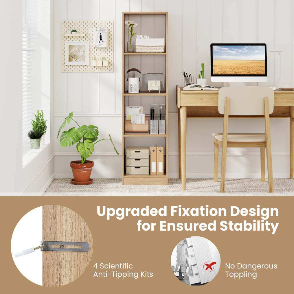 ● Anti-toppling Device: The storage organizer is designed with sturdy baseboard, which is fitted with protective foot pads for better stability. Furthermore, to keep the tall bookcase from wobbling or tipping over, there are altogether 4 anti-toppling kits to help fix the display shelf to the wall.
