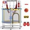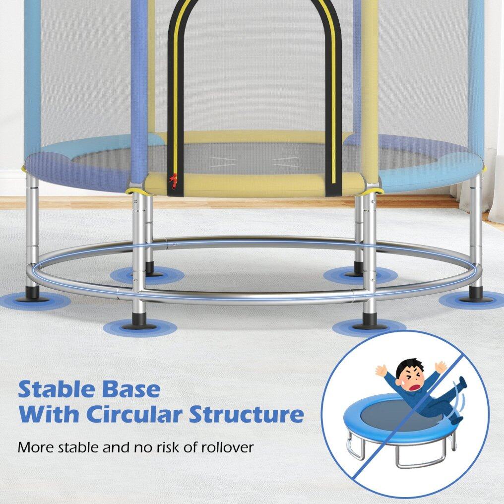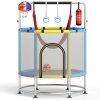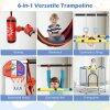 6-in-1 Kids Trampoline: More than just bouncing, our 55" kids trampoline offers an all-in-one fun center for your active little ones. It comes with an adjustable gymnastics bar, allowing you to add fun accessories like a boxing bag, a hammock, 2 gymnastic rings, and a basketball hoop.
