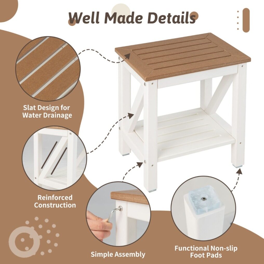 ● Multi-purpose Design: Apart from a shower bench in the bathroom, it can also serve you in other rooms. For instance, you can use it as a sofa side table in the living room. Additionally, it can also serve as a nightstand in the bedroom, a plant stand on the balcony.