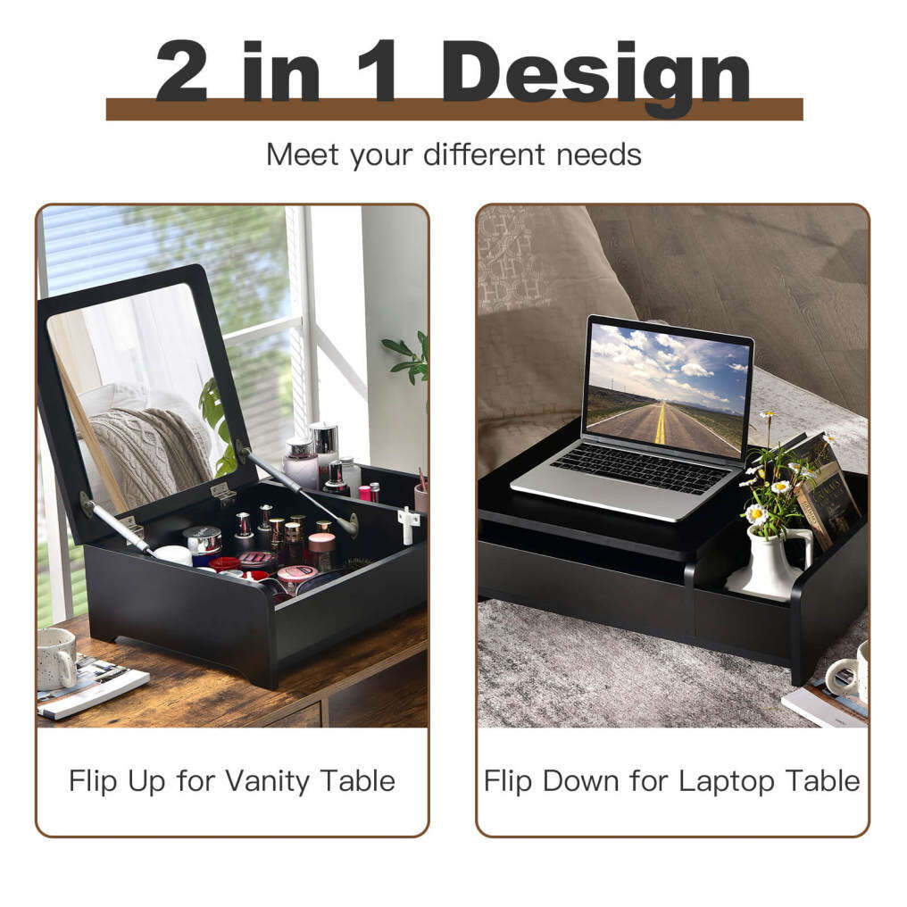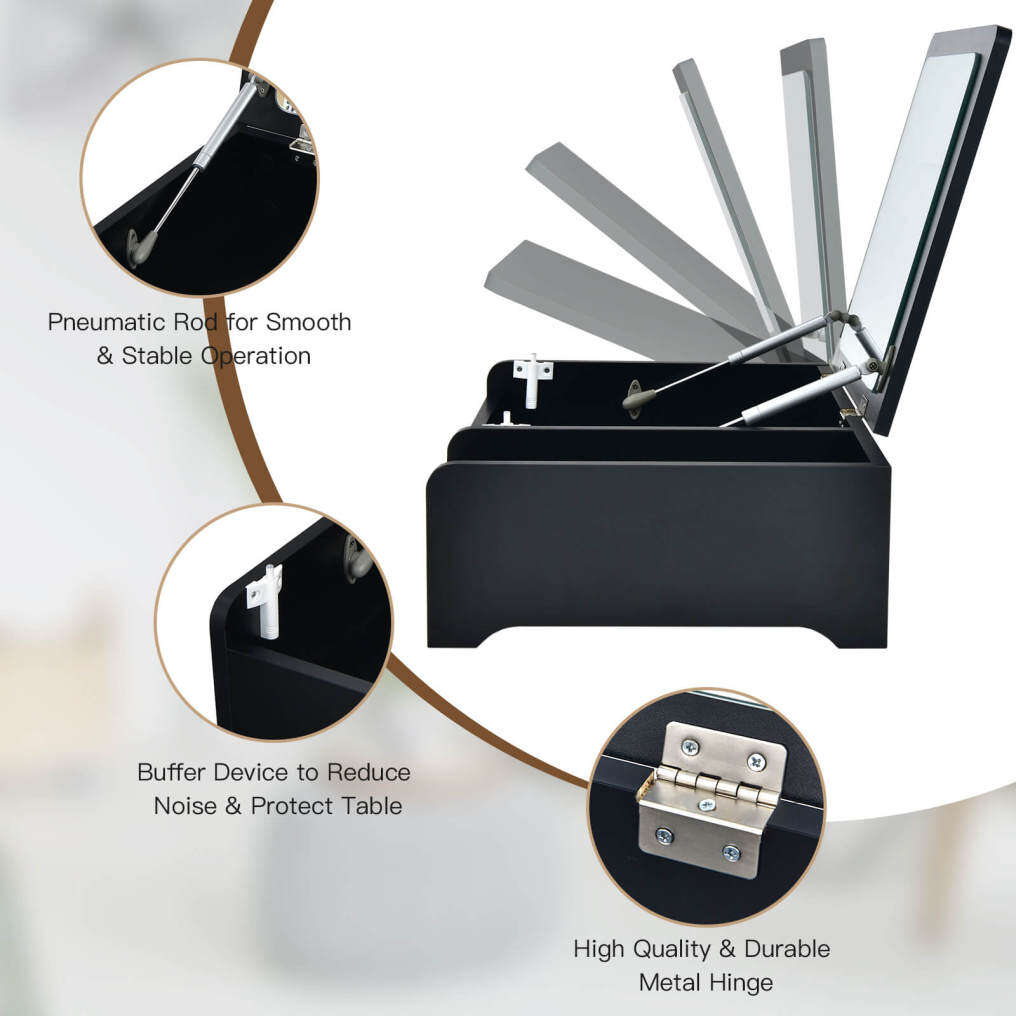 ● Flip Top Mirror for Dual Use: Featuring a flip-top design, the mirror of this countertop vanity table is easy to flip up and down for your daily makeup. And you can put down the mirror to use it as a laptop desk conveniently. The heavy-duty pneumatic rods and anti-bumping devices ensure smooth and silent operation.