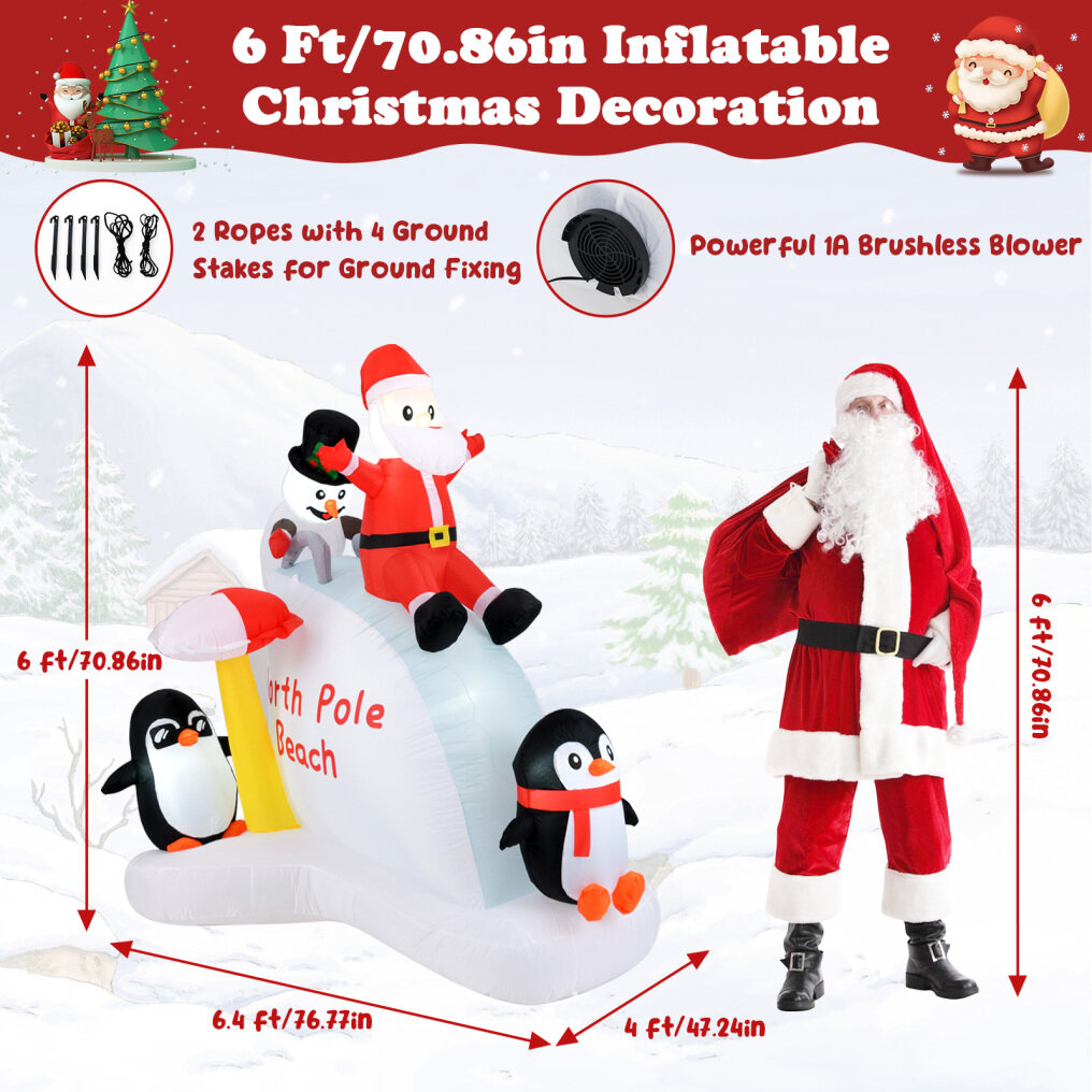 ● Adorable Design: Our Christmas inflatable showcases a cheerful Santa Claus, a small penguin, a cool penguin with umbrella, and a climbing snowman playing around an ice slide. This playful scene brings the charm of polar regions right to your doorsteps.