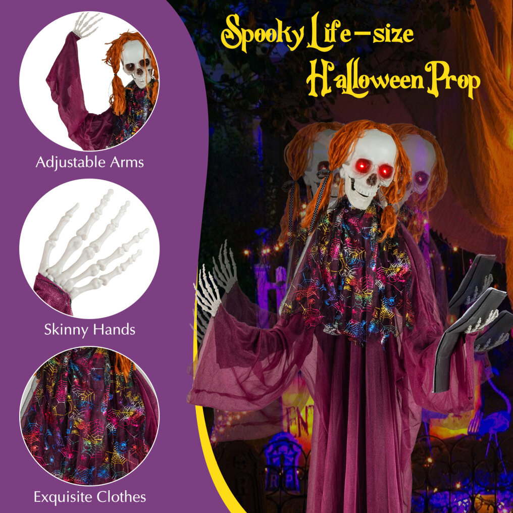 ● Stunning Details and Quality: This life-size standing girl Halloween animatronic is crafted with attention to detail. From her spooky face, skinny hands, realistic book to her exquisite clothes, she's dressed to distress.