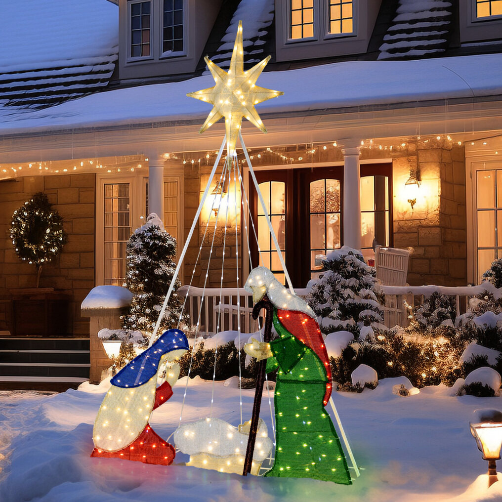 ● Weatherproof Materials: Constructed with all-weather materials, this pre-lit nativity set is sunproof, IP44 waterproof and windproof. The heavy-duty metal frame offers exceptional stability, making it a reliable addition to your outdoor display.