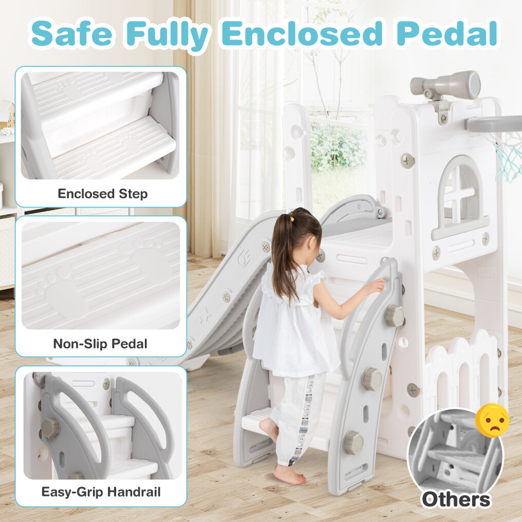 This multifunctional playset features a telescope, climber, basketball hoop, hiding spot, and storage area, providing endless fun and adventure. Experience the thrill of the acceleration zone, the enjoyment of a smooth, gentle deceleration zone, and the secure stop in the buffer zone with our advanced safety slide. Built with Safe Fully Enclosed Pedal, this slide ensures the utmost safety during play. Its triangle-shaped structure with heightened handrails and an extra-wide waiting area ensures stability and added safety, making it a trusty backyard companion for any parent. Crafted from HDPE materials that AS/NZS IOS 8124 and EN71 certified, this slide is not only safe but also environmentally friendly. The perfect gift for enhancing motor and social skills, it promotes healthy growth and active play while fostering enjoyable and safe childhood experiences.