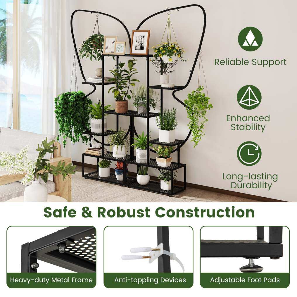 This 6-tier metal plant shelf set includes 2 stands, each measuring 87 x 26 x 185 cm (L x W x H), which can be used as two separate units or as one harmonious piece in a unique butterfly shape, making it a striking addition to any space. Each of the 6 tiers is optimally spaced allowing for abundant sunlight, promoting healthy plant growth across the multiple large and small shelves. Constructed from a robust metal frame, complemented with adjustable foot pads and anti-toppling devices, our plant stand ensures your plants stay upright and secure in any environment. Not just for plants, this versatile stand can also showcase a variety of items like books, photos, and crafts, making it an ideal choice for your living room, balcony, or studio. Thanks to its metal mesh shelves, maintenance is also a breeze while effectively preventing water accumulation. Elevate your decoration while keeping your plants thriving with this elegantly crafted plant stand.