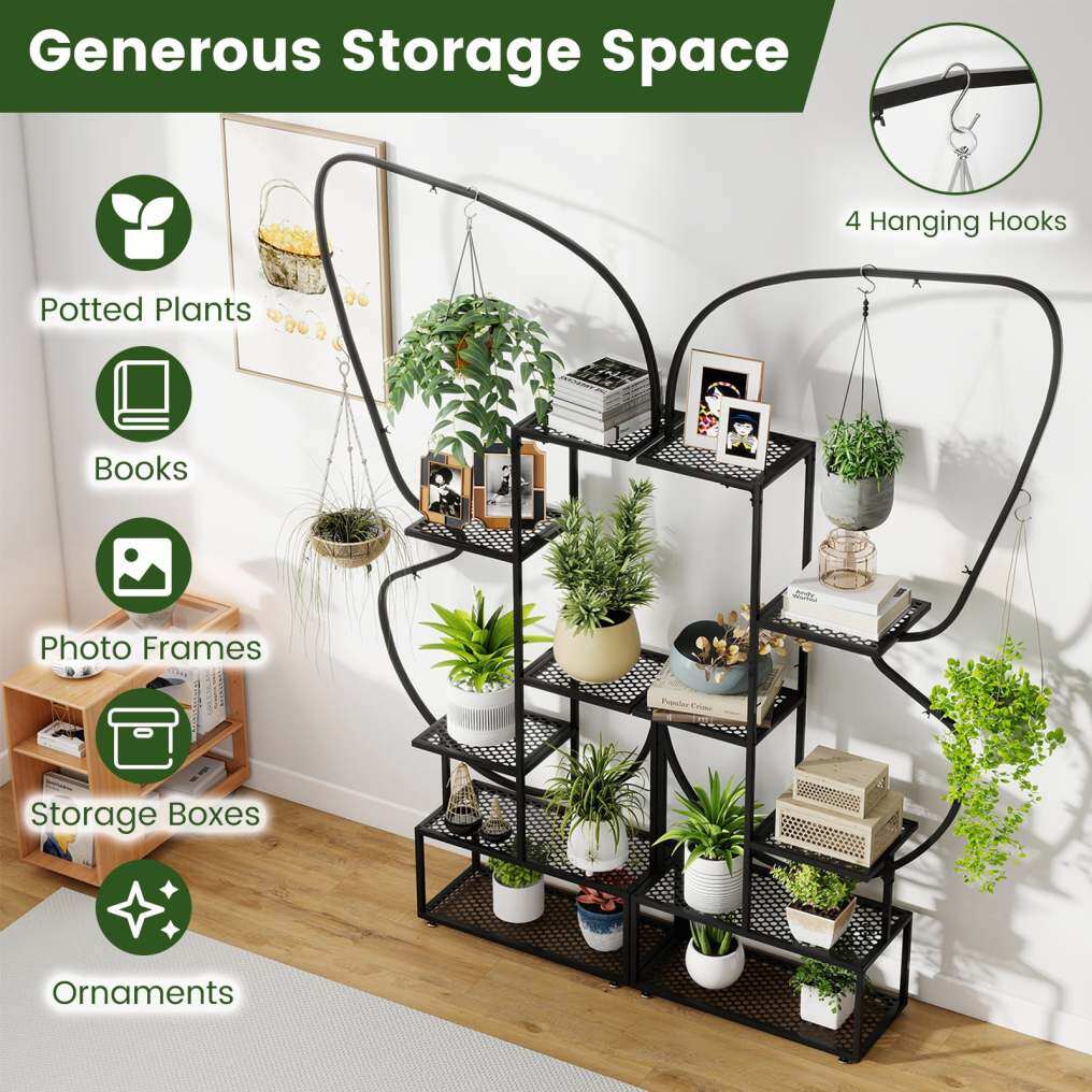 Wide Spacing and Multi-Layer Layout: This 6-tier plant stand includes 4 large metal mesh shelves, 8 small metal mesh shelves, and 4 hanging hooks, offering large space to display potted plants and hanging flower baskets. Plus, the cleverly spaced shelves optimize space and sunlight exposure without interfering with each other.