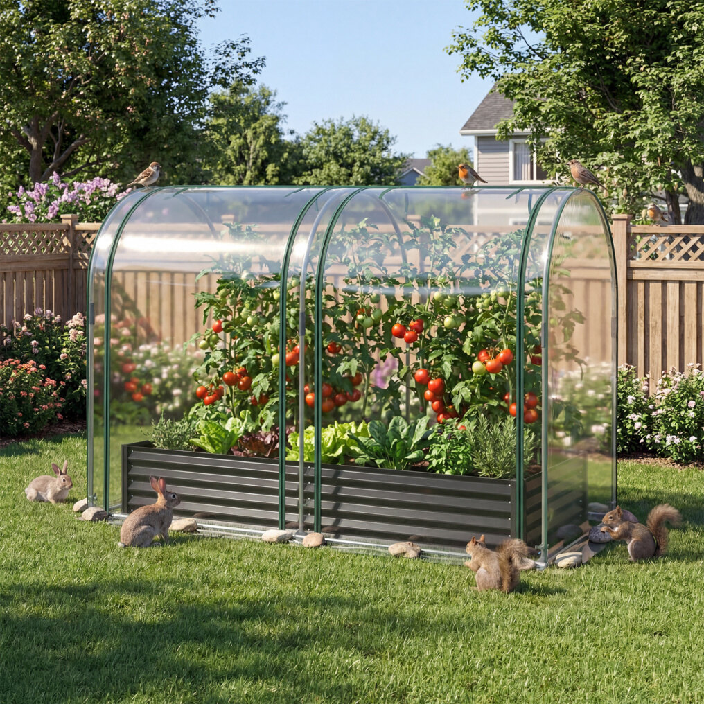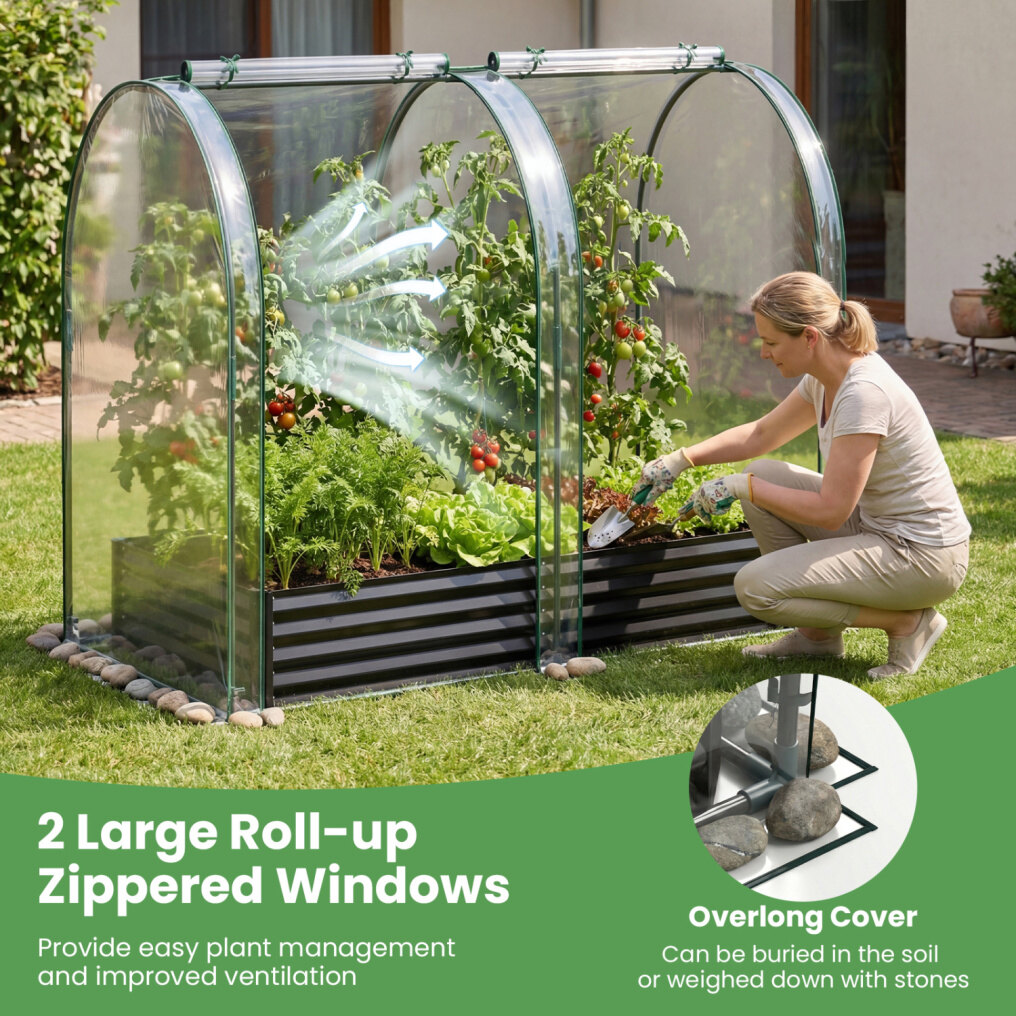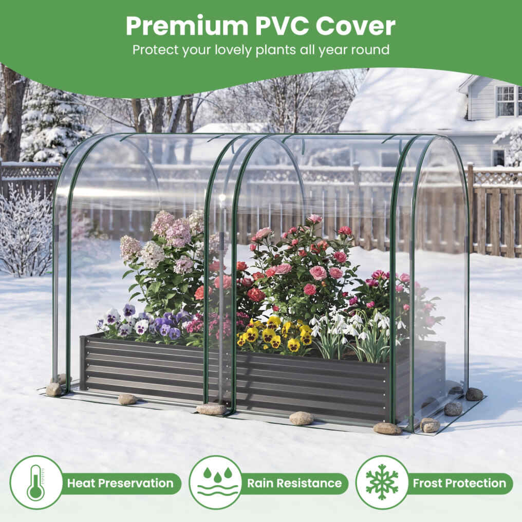 ● Open Base Advantage: The open-ended base of raised planter is built to promote natural drainage and allow roots to grow deeply into the soil, ensuring healthy plant growth. Its greenhouse includes an overlong cover that can be buried in the soil or weighed down with stones, adding stability.