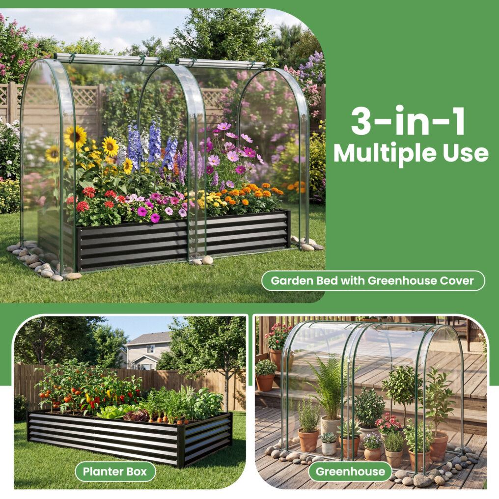 ● 3-in-1 Multiple Use: This versatile garden bed with greenhouse cover includes a galvanized planter box and a mini greenhouse, which can be used together or separately. It swaps in seconds to match changing weather and planting needs, making year-round harvests feel easy.