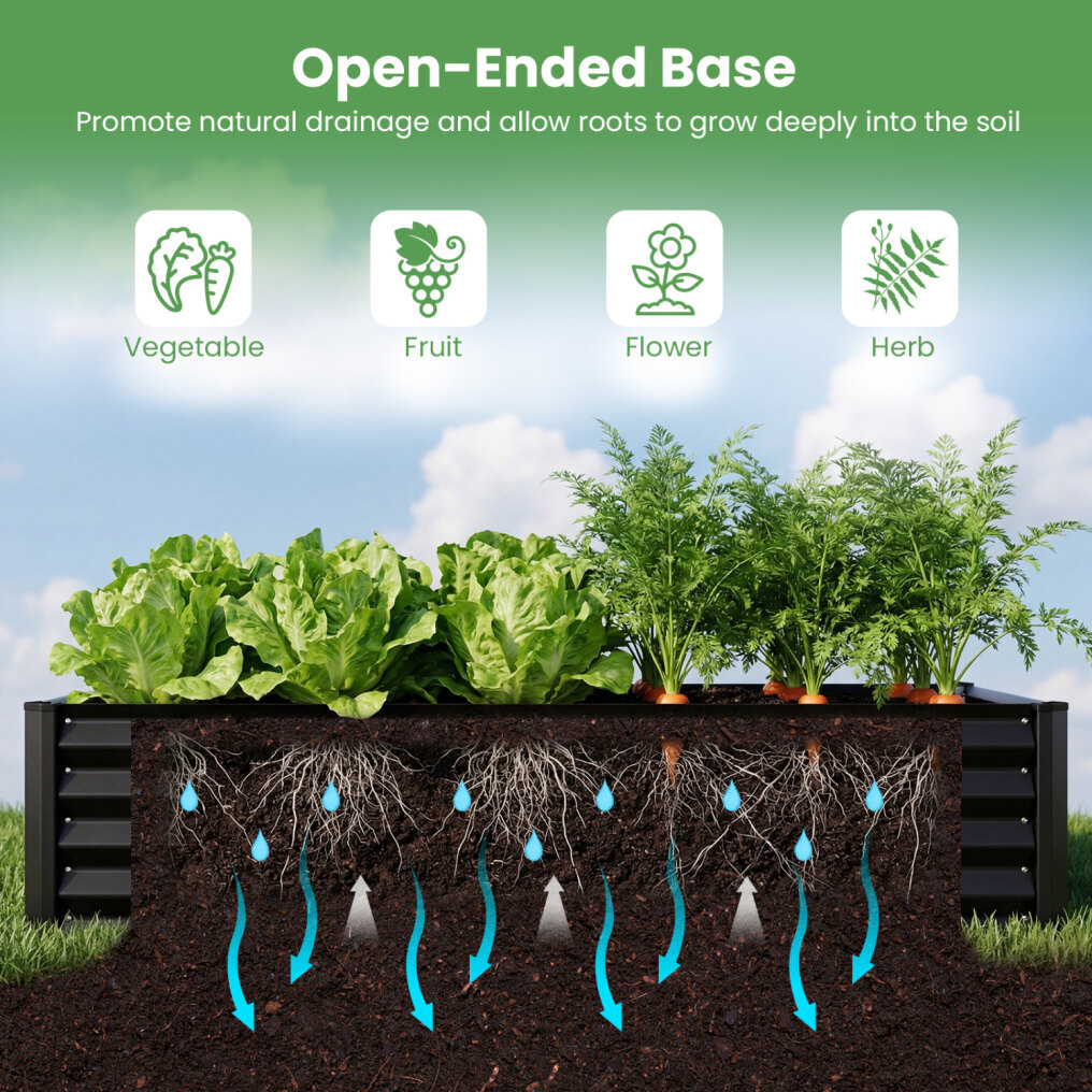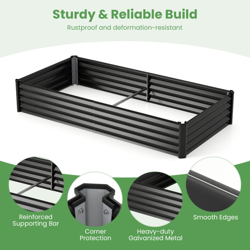 ● Sturdy and Reliable Build: The elevated planter box is made of heavy-duty galvanized metal that is rustproof and deformation-resistant, built to last. Corner protection enhances everyday safety, the middle reinforced supporting bar adds dependable strength, and the smooth edges bring a cleaner finish suited for long-term outdoor use.