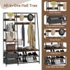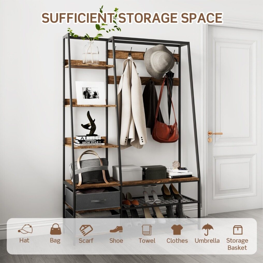 | perfect home storage solution | our all-in-one hall tree provides you with sufficient storage space, including 6-tier shelves, 2 fabric dressers, 1 shoe bench and a 2-tier shoe rack. besides, 9 dual hooks help to keep your hats, bags, clothes and scarves well organized. each dual hook can hang items of no more than 2 kg. |