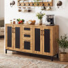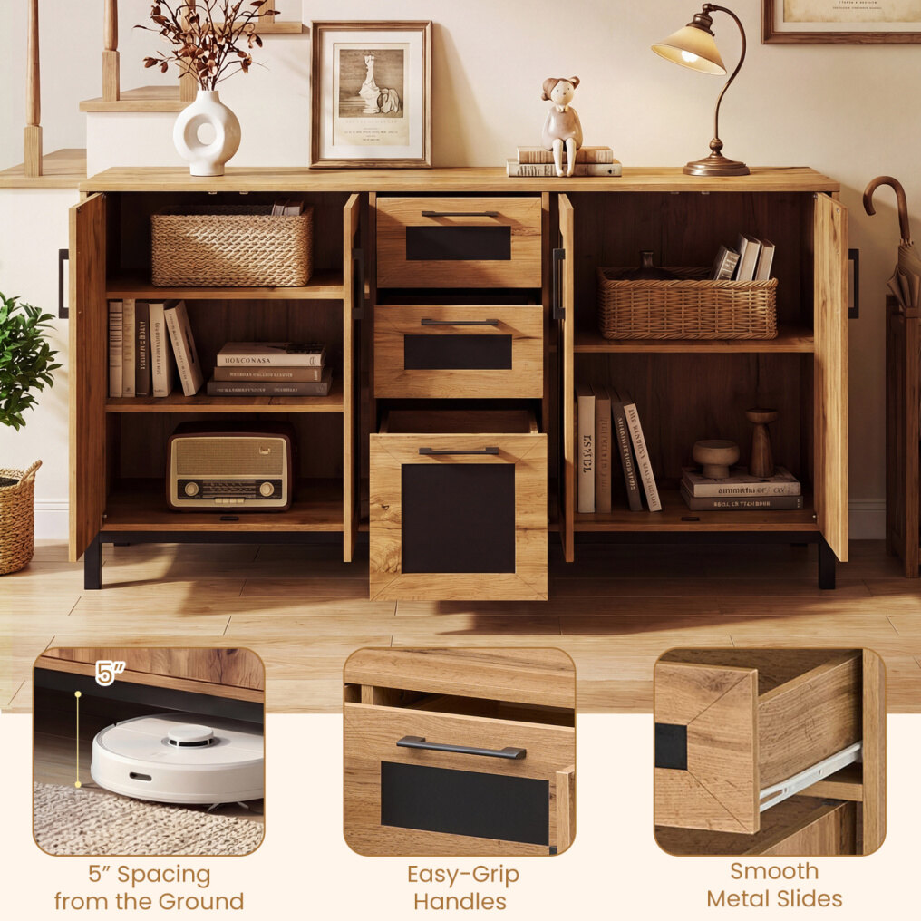 ● Ample Storage Space: This buffet sideboard features a generous 63-inch top along with 3 drawers, plus 2 double-door cabinets. It offers plenty of room to tidy up your kitchen tools, dining items, or everyday belongings.