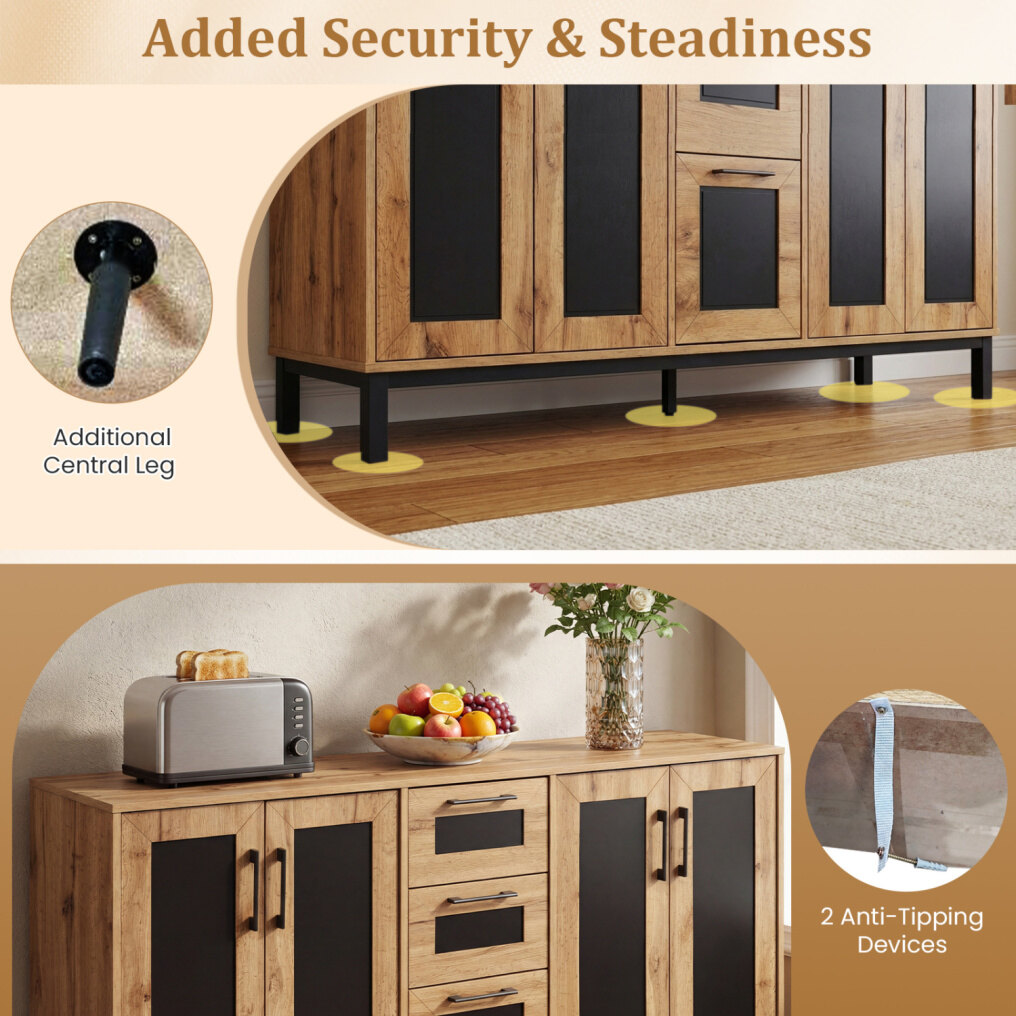 ● Robust Support Structure: Built with a strong wooden frame, the sideboard includes an additional central leg for reinforced 5-point stability. The storage organizer also comes with 2 anti-tipping devices for added security and steadiness.
