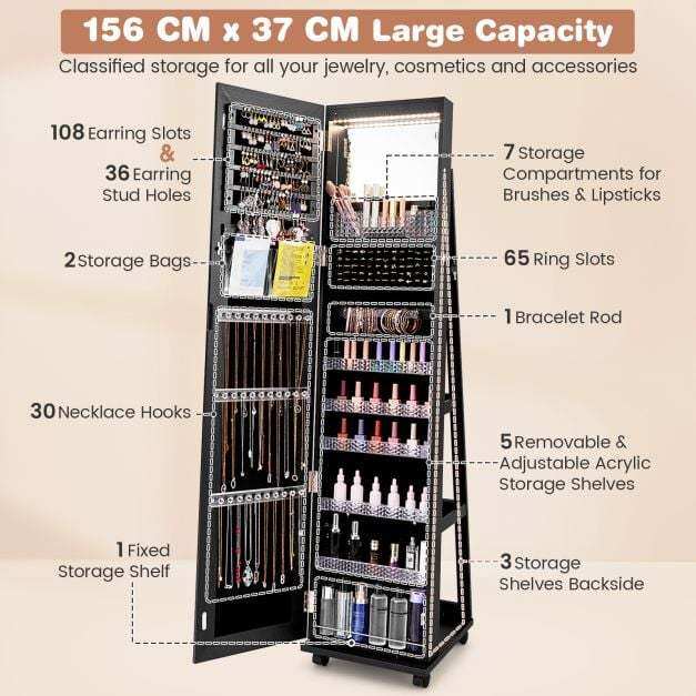 ● 61.5" x 14.5" Large Capacity: The jewelry cabinet offers classified storage for all your jewelry, cosmetics and accessories, which includes 108 earring slots, 36 earring stud holes, 2 storage bags, 30 necklace hooks, 7 storage compartments for brushes and lipsticks, 65 ring slots, 1 bracelet rod, 5 removable and adjustable acrylic storage shelves, 1 fixed storage shelf and 3 storage shelves backside.