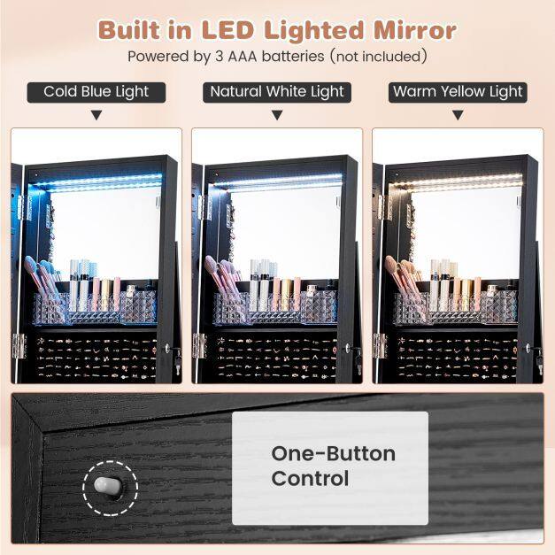 ● Built-in LED -Lighted Mirror: The interior makeup mirror is equipped with bright 3-color LED lights (blue, white + blue, yellow), which brings more convenience to your morning routines. And one-button control makes operation simple. Note: powered by 3 AAA batteries (not included).