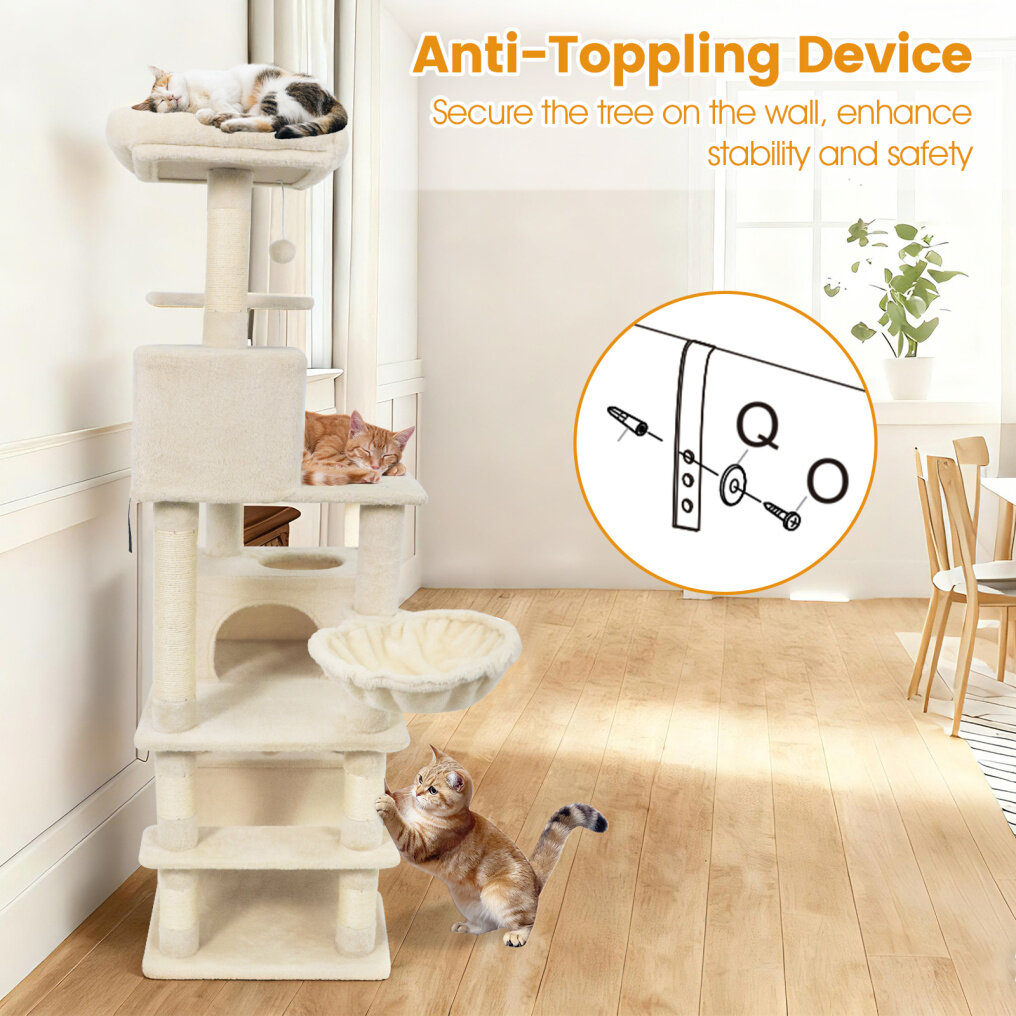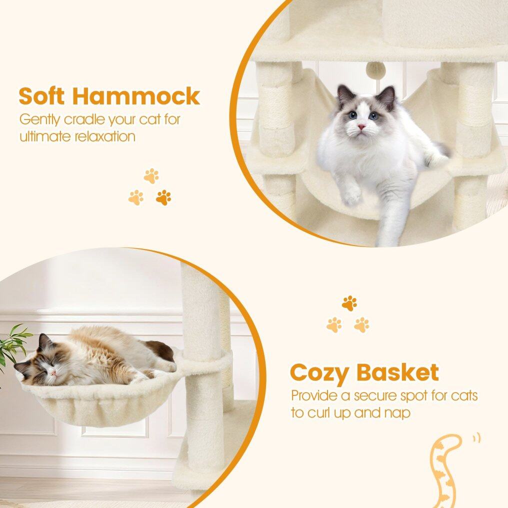 ● Multiple Resting Spots for Relaxation: This tall cat tree features 2 cozy top perches, 2 spacious cat condos, a soft hammock, and a comfortable basket - providing a variety of relaxing and private spaces for your cats. Each spot is thoughtfully designed to cater to cats' needs for napping, lounging, and observing their surroundings.