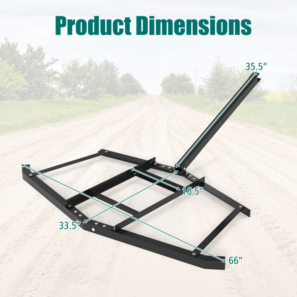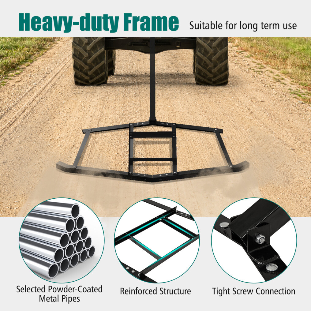 ● Easy Attachment to Different Vehicles: This leveling harrow can be easily attached to different types of vehicles, including UTVs, ATVs, garden tractors, and utility tractors. The inclusion of a pin hitch makes the connection process quick and secure, giving you the flexibility to use the harrow with your existing equipment.