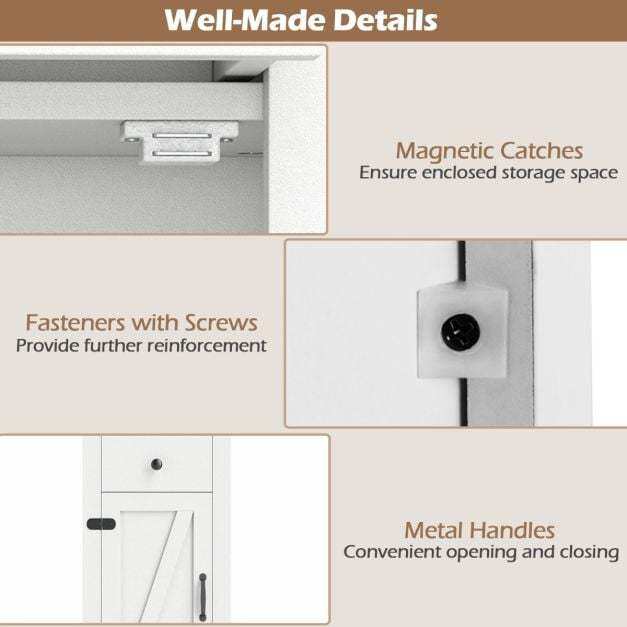 ● Charming Farmhouse Aesthetic: Enhance your bathroom decorations with the floor cabinet's captivating farmhouse rustic design, highlighted by an iconic barn door feature. This stylish element adds a touch of country charm to your space.