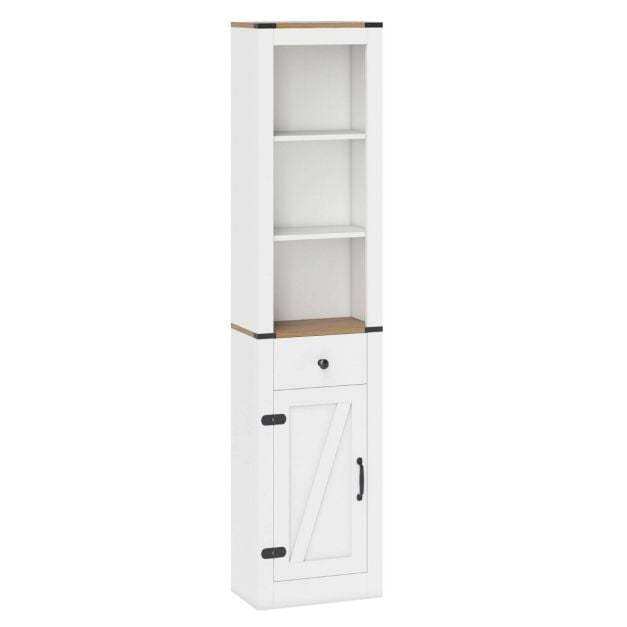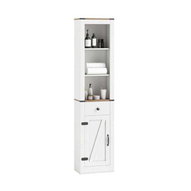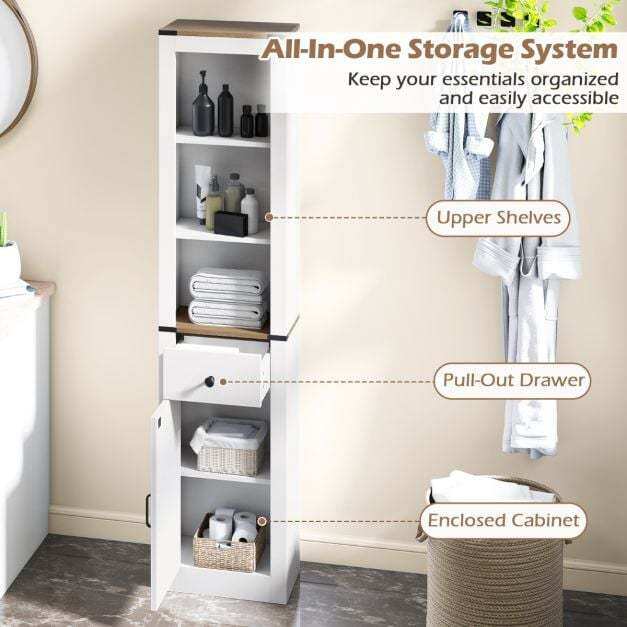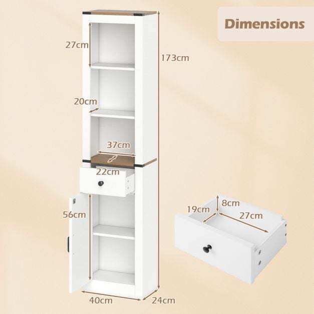 ● All-In-One Storage System: The bathroom cabinet boasts multiple open shelves, a handy drawer, and a fully enclosed cabinet area. Ideal for storing towels, toiletries, and other essentials, this cabinet keeps your bathroom clutter-free.