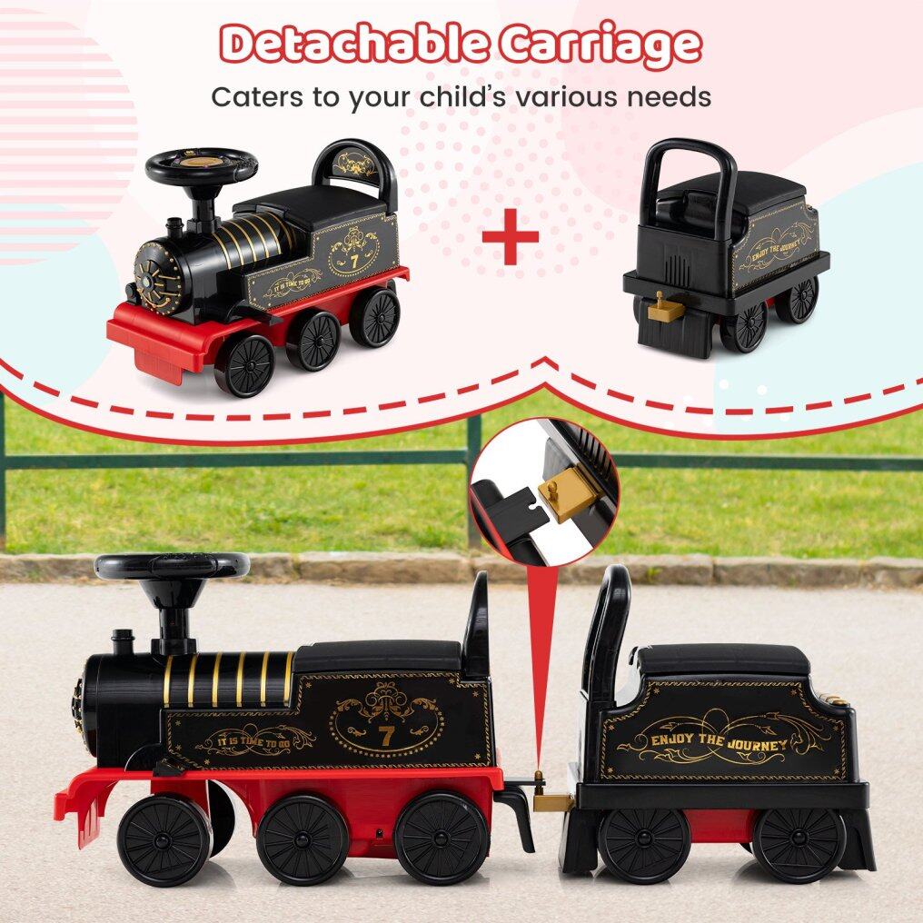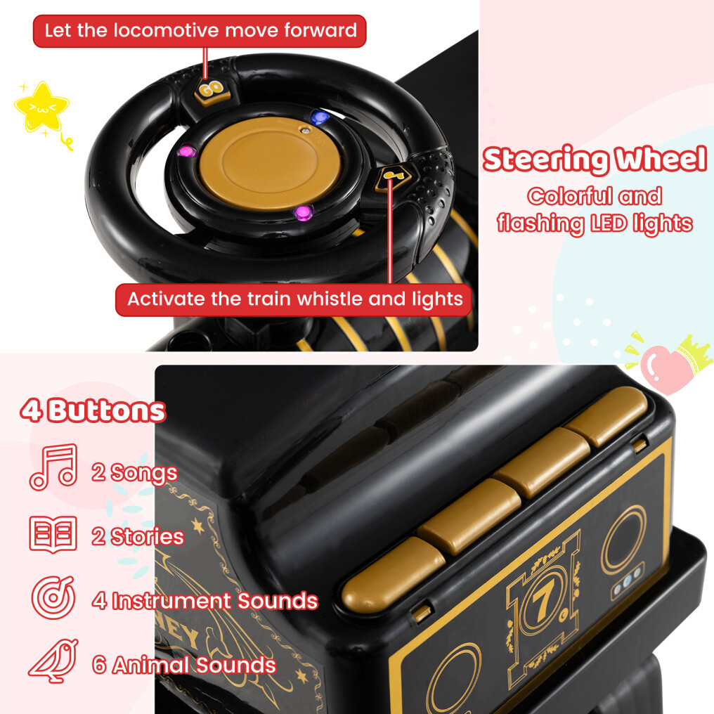 ● Detachable & Fun Carriage: With 4 buttons, the carriage plays 2 songs, tells 2 stories, and introduces 4 musical instruments and 6 animal sounds, making every ride an interactive experience. Moreover, the carriage can be easily detached according to your kid's preference.