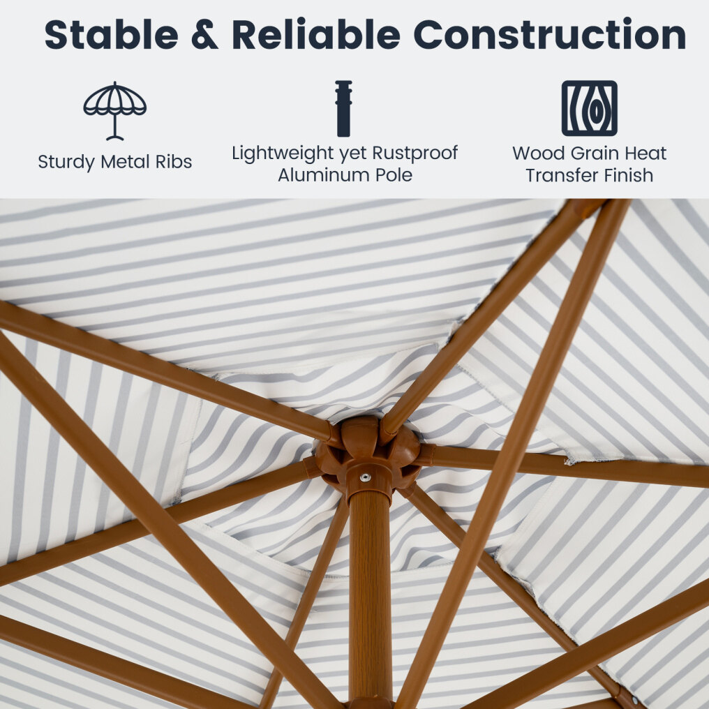 ● Stable & Reliable Construction: Supported by sturdy metal ribs and a lightweight yet rustproof aluminum pole with a realistic wood-grain heat transfer finish, this outdoor umbrella balances elegance with stability, ensuring safe shade for families and friends. Note: Umbrella base required, not included.