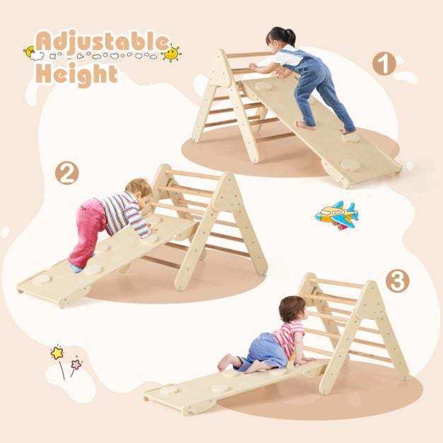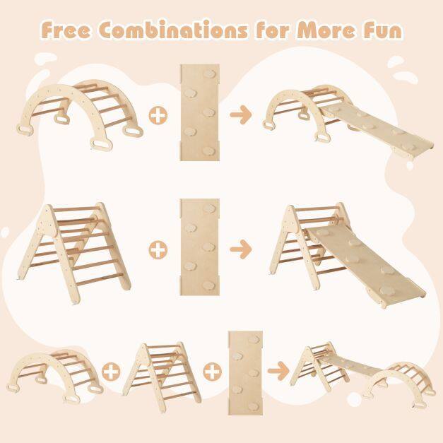 ● 7-in-1 Multifunctional Design: The pikler triangle set of 3 includes a triangle climber, a climbing arch, and a ramp, which can be used together with 2 or 3, or used separately. The triangular climber can also be flipped over as a rocking arch. And you can explore more ways of play.