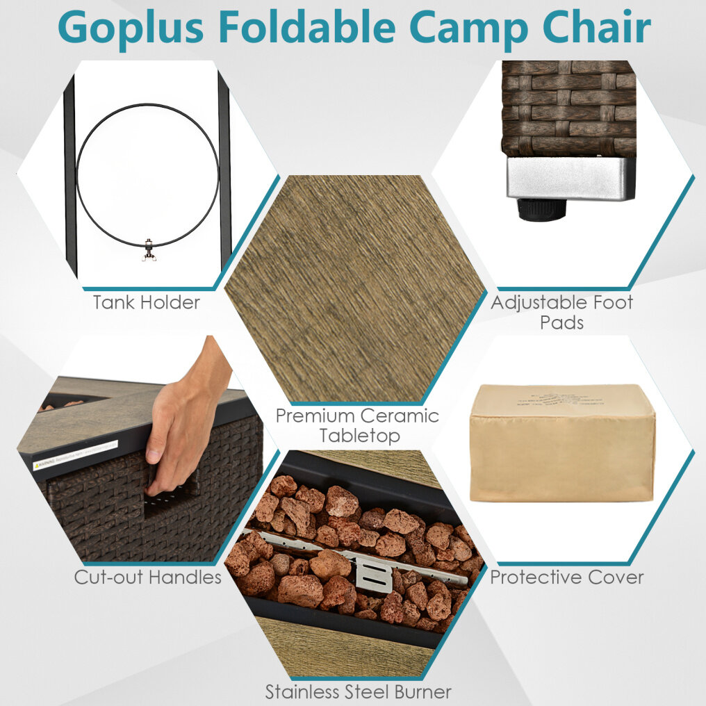 ● 2-in-1 Fire Pit Table: The centerpiece of this set is the ETL-certified fire pit, which offers dual functionality. Enjoy the warmth and ambiance of a fire pit with an impressive 40,000 BTU heat output and a simple ignition system, or use it as an extra coffee table with a removable lid. The included fire pit protective cover ensures it stays in pristine condition.