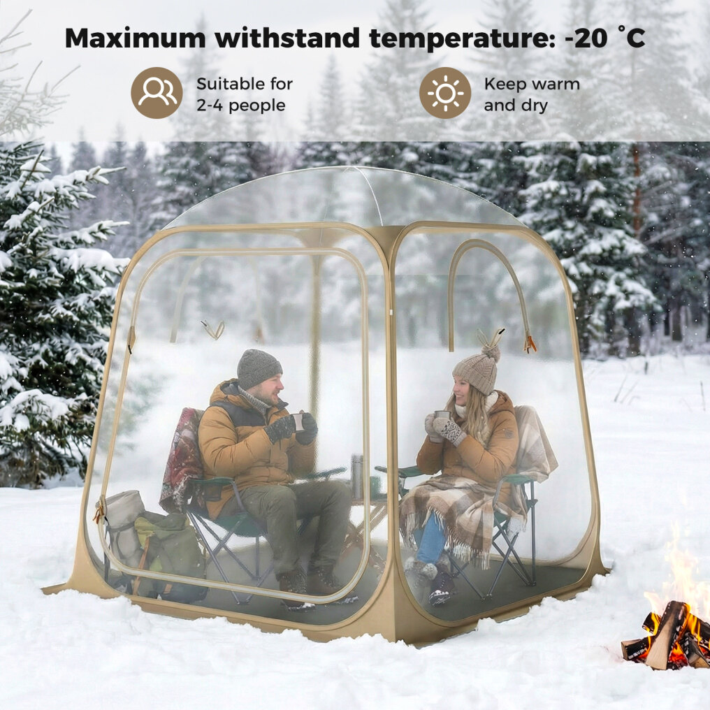 ● All-Around Visibility: The 7 x 7 ft high-transparency PVC plastic tent offers a 540° clear view while allowing natural lights in, making it perfect for stargazing, filming memories, or keeping an eye on the action during chilly games. Stay warm and enjoy the outdoors in a cool-proof, waterproof, rip-resistant, and sun-protective enclosure. (Maximum withstand temperature: -4 °F)