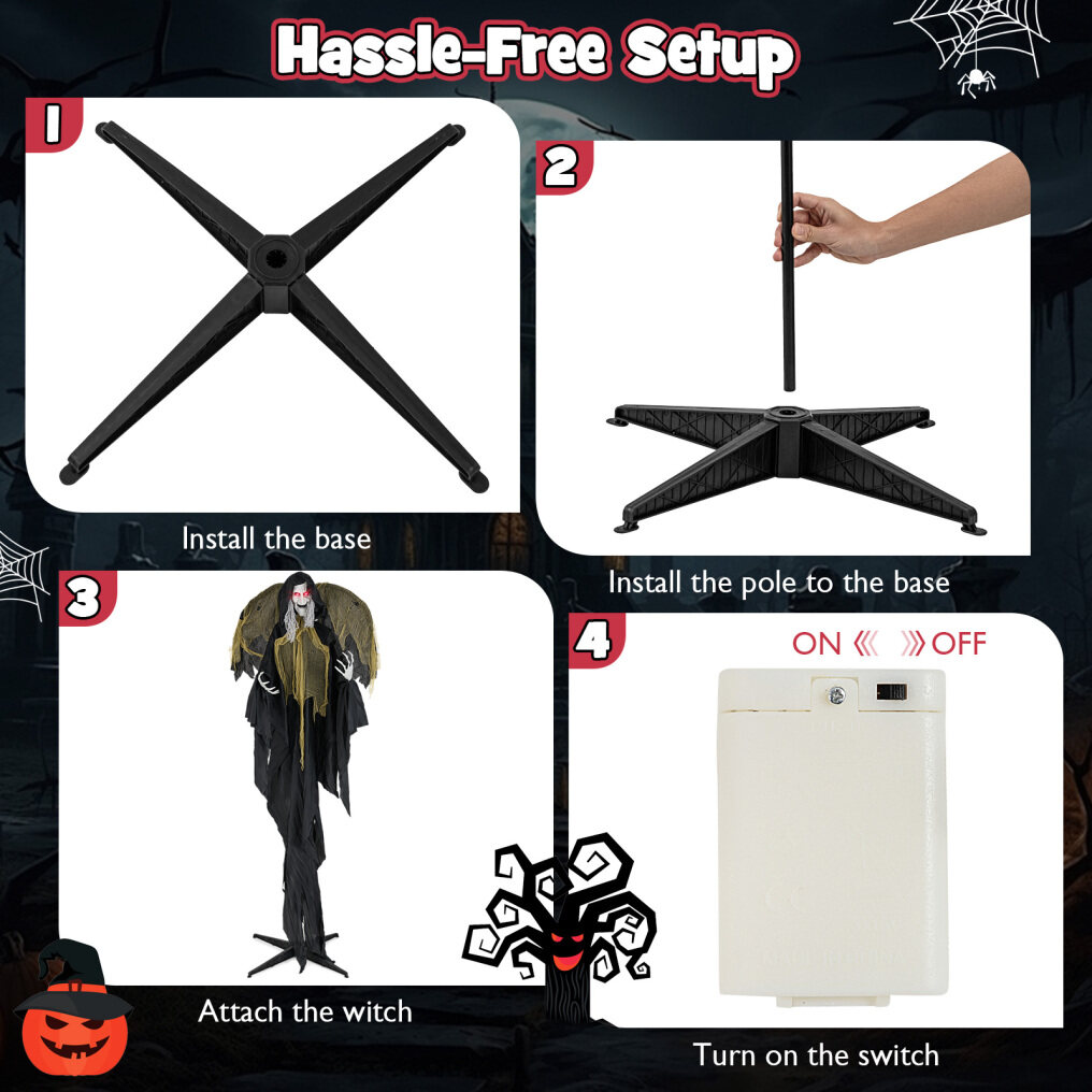 ● Hassle-Free Setup: Setting up this menacing witch is straightforward and quick. You just need to install the base, install the pole to the base, attach the witch, turn on the switch and wait for trick-or treaters to come.