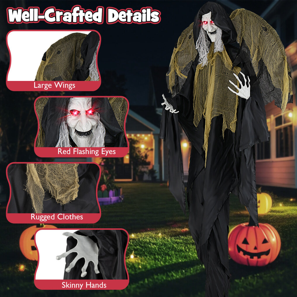 ● Terrifying Sounds and Eyes: Equipped with terrifying roar, "hehehe" and sinister glowing eyes, this witch with wings sets a horrifying ambiance. The lighted eyes flash ominously, adding a horrifying depth to its ghostly apparitions.
