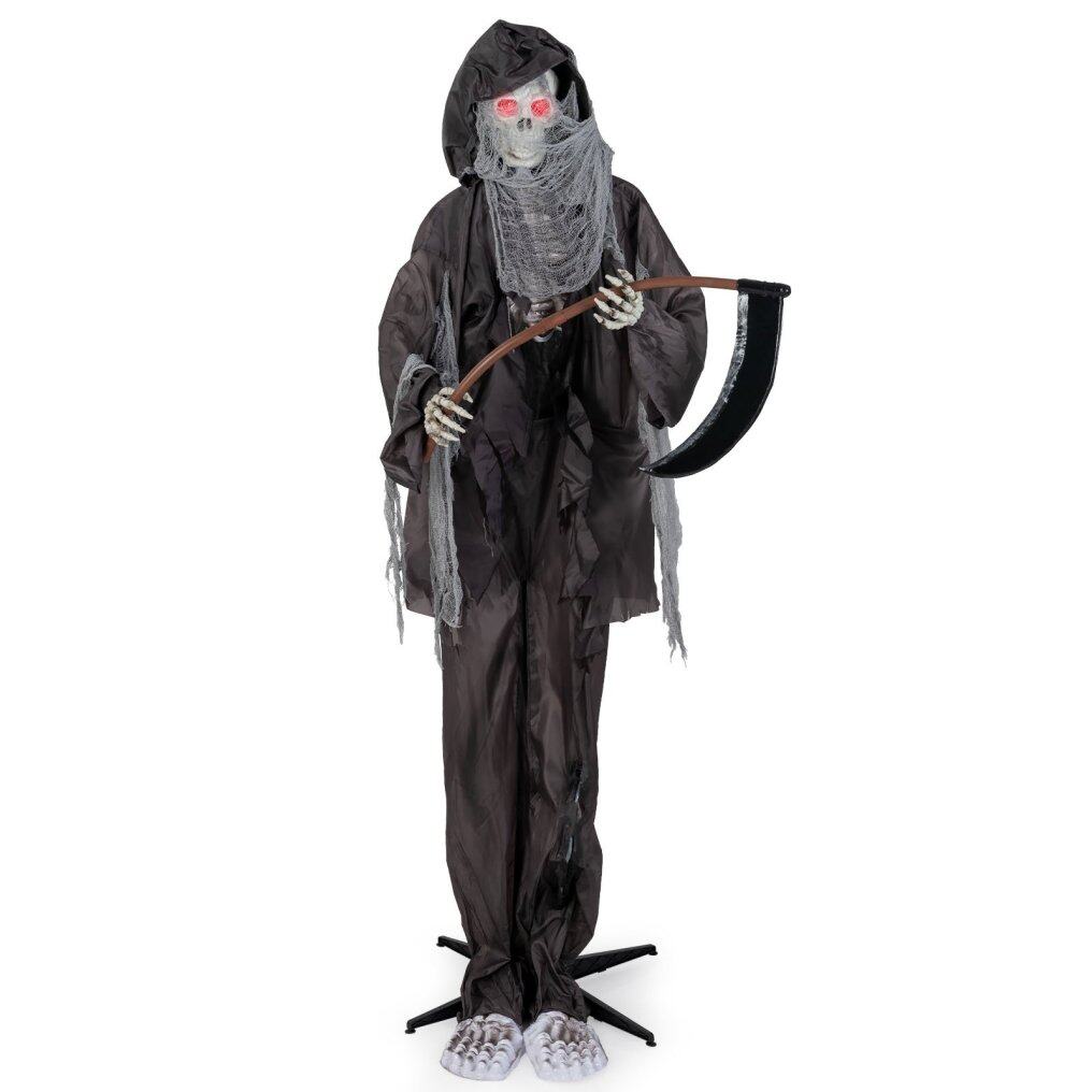 ● Sound-Activated Design: This animated grim reaper springs to life with horrific sounds and light-up eyes, reacting to any noise with a sound sensor. Note: Need to insert 3 AAA batteries (not included).