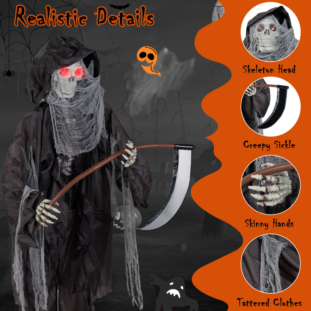 ● Lifelike Horror Details: With its creepy sickle, skinny hands, and body clothed in tattered garb, this 8.5 ft standing Halloween decoration is made with realistic details to bring you an unforgettable Halloween experience.