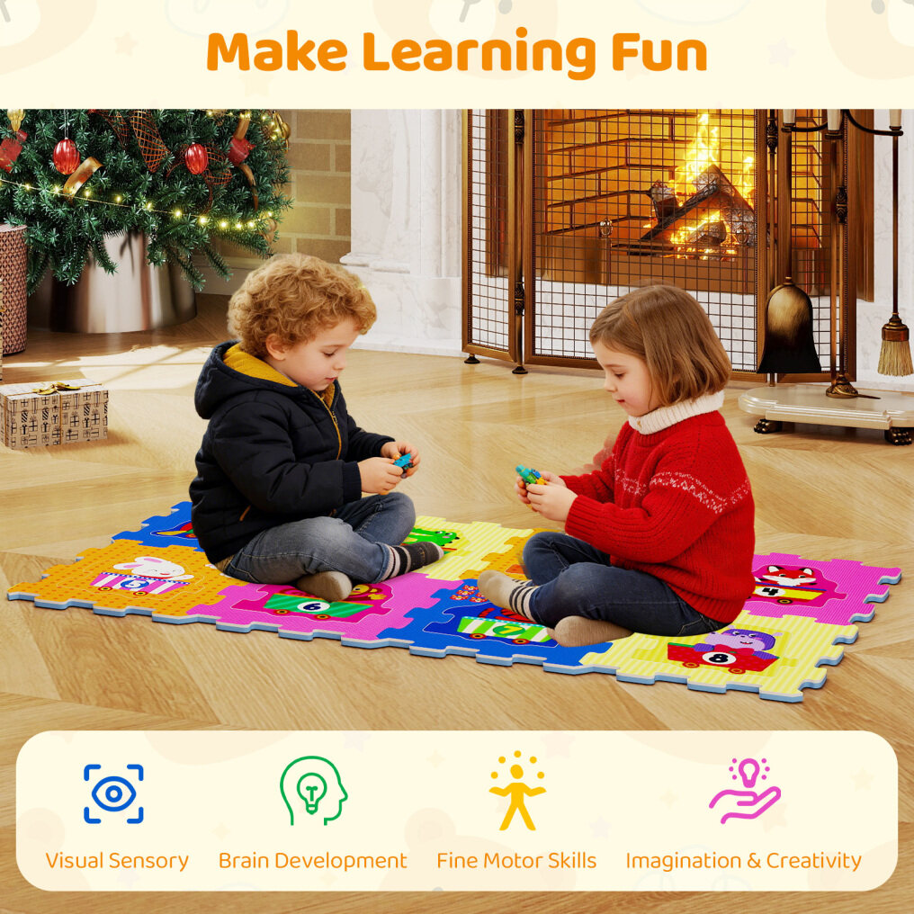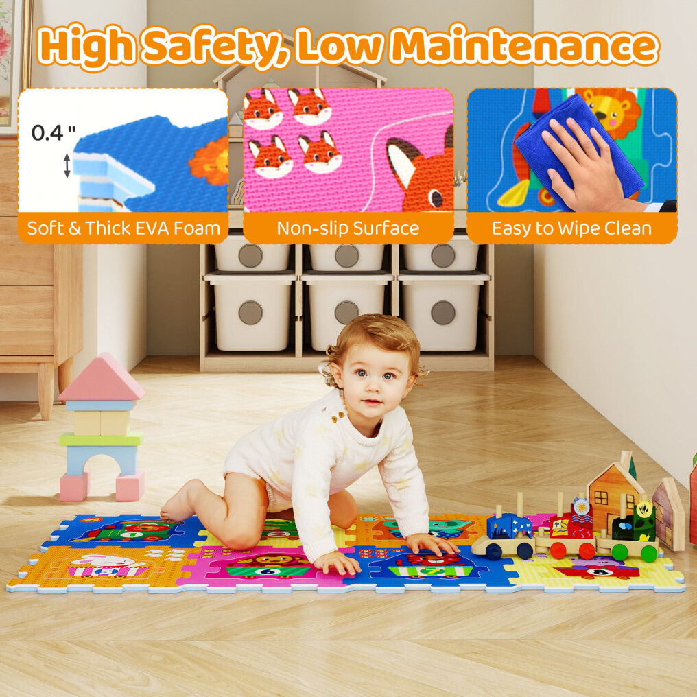● Safe & High-grade Material: Crafted from soft & thick EVA foam, our 8-piece foam puzzle mat provides a safe and comfortable play area for your little ones. The anti-slip textured surface enhances safety, while the waterproof, easy-to-clean design means more play and less mess.