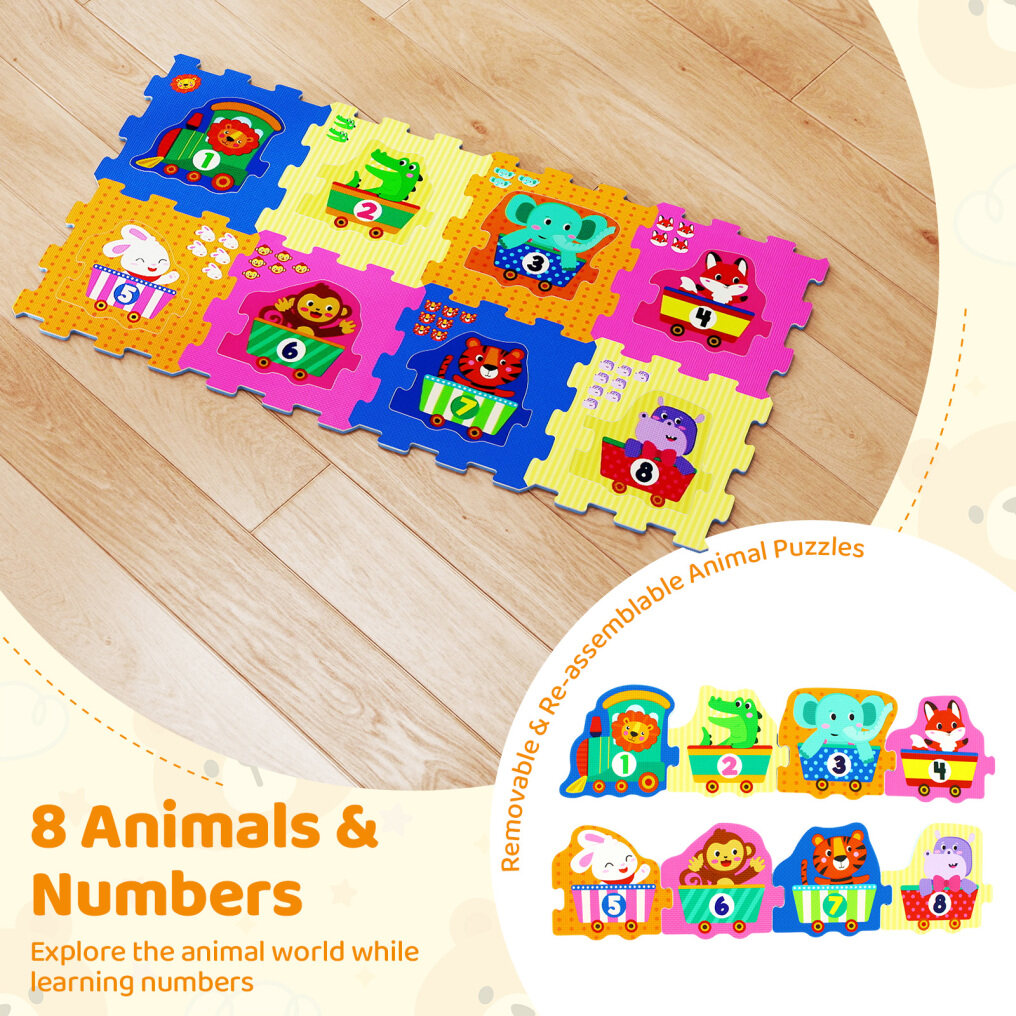 ● Educational Puzzle Play Mat: Our foam puzzle mat features 8 vibrant animal patterns & numbers. Each animal puzzle piece can be removed and re-assembled for added fun. The engaging designs promote kids' development by enhancing cognitive abilities, sensory perception, and creative imagination.