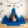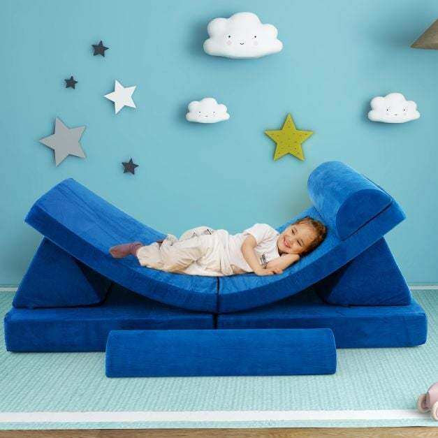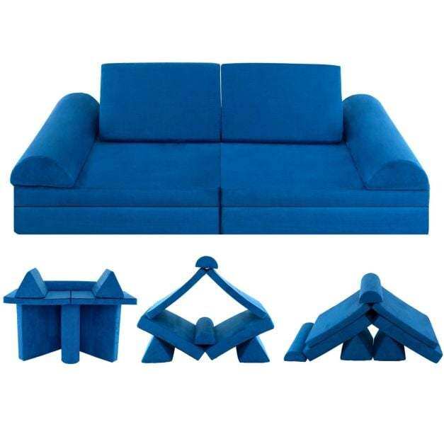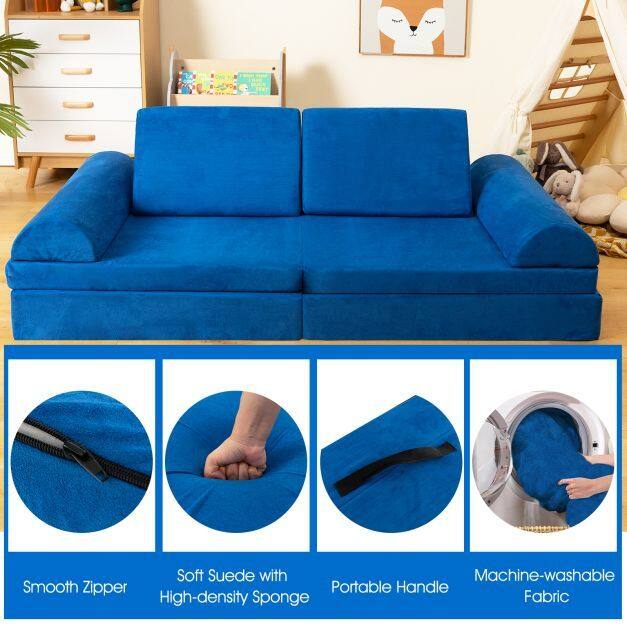 ● 8 Piece Modular Kids Sofa: Consisting of 2 triangular pillows, 2 semi-circular cushions, a thick folding mat and a thin folding mat, this 8-piece children's toy set can be easily reconfigured into 2 chairs, a sofa, a tunnel, a fort, a car, a tent, a slide, a bed lounge or anything that your kids can imagine.