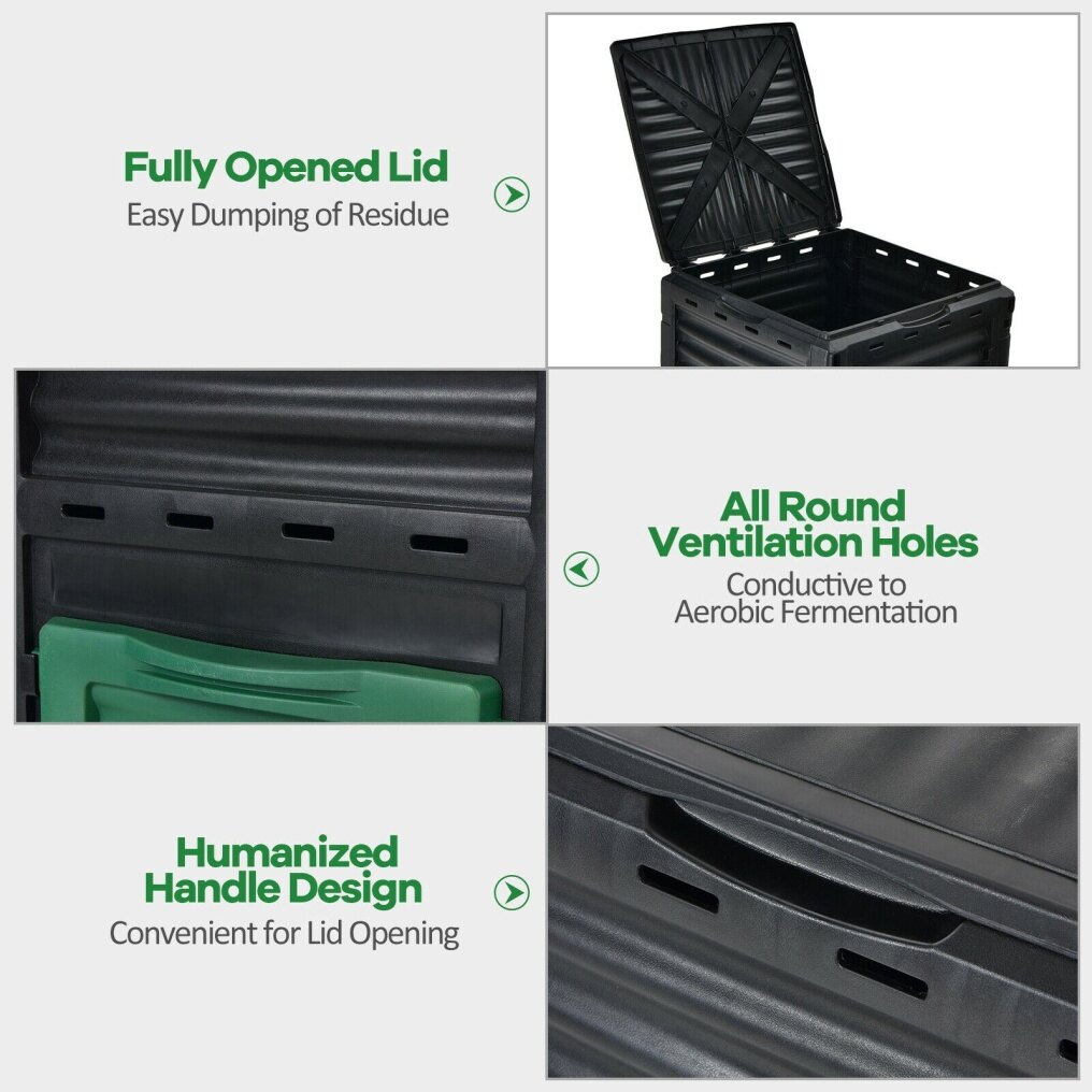 ● Premium Material Ensures Lasting Durability: Made of premium PP, this garden composter with stable physical properties is high-hardness and weather-resistant for long-term outdoor use. What's more, the black PP can maintain heat and regulate moisture in the composting process.
